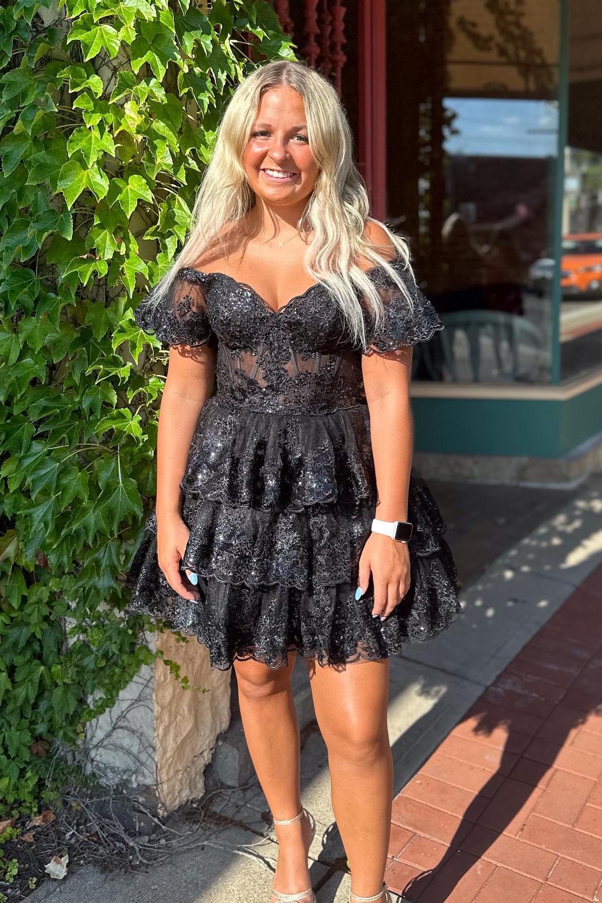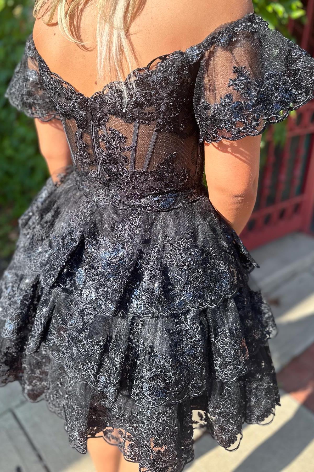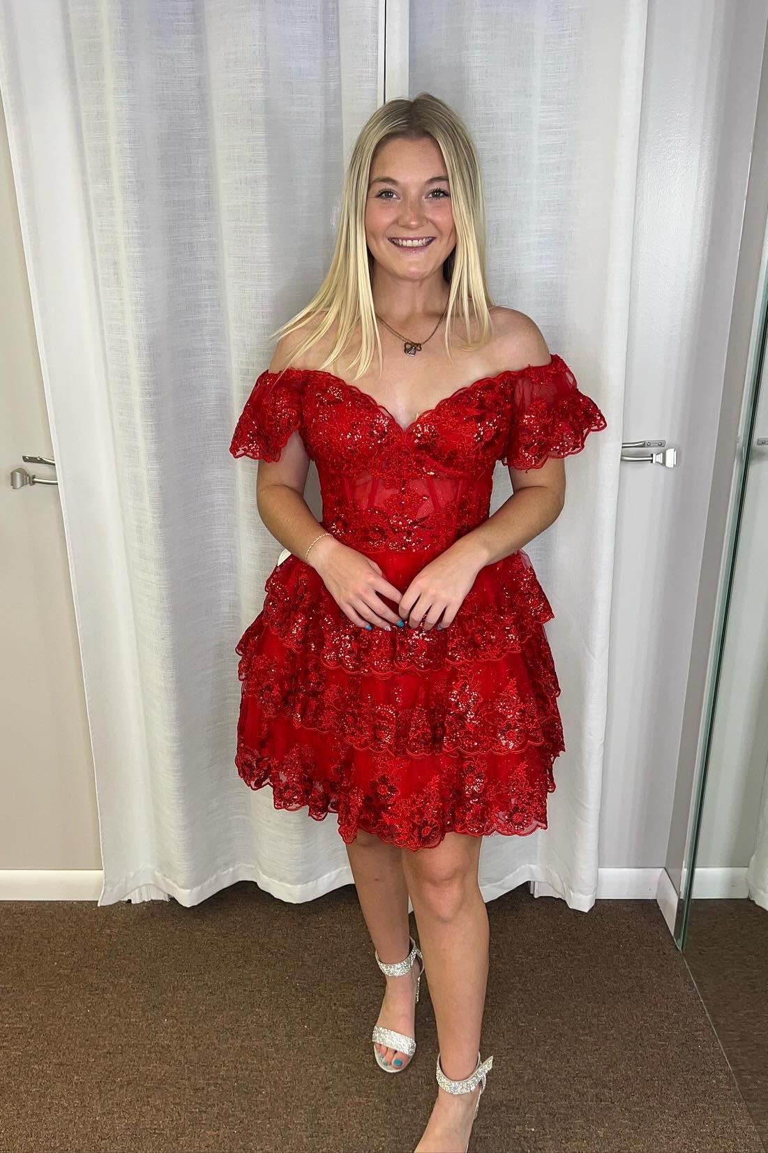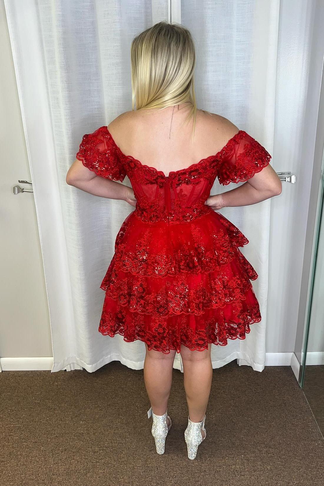 Off the Shoulder Red Appliques Tiered Ruffle Dress