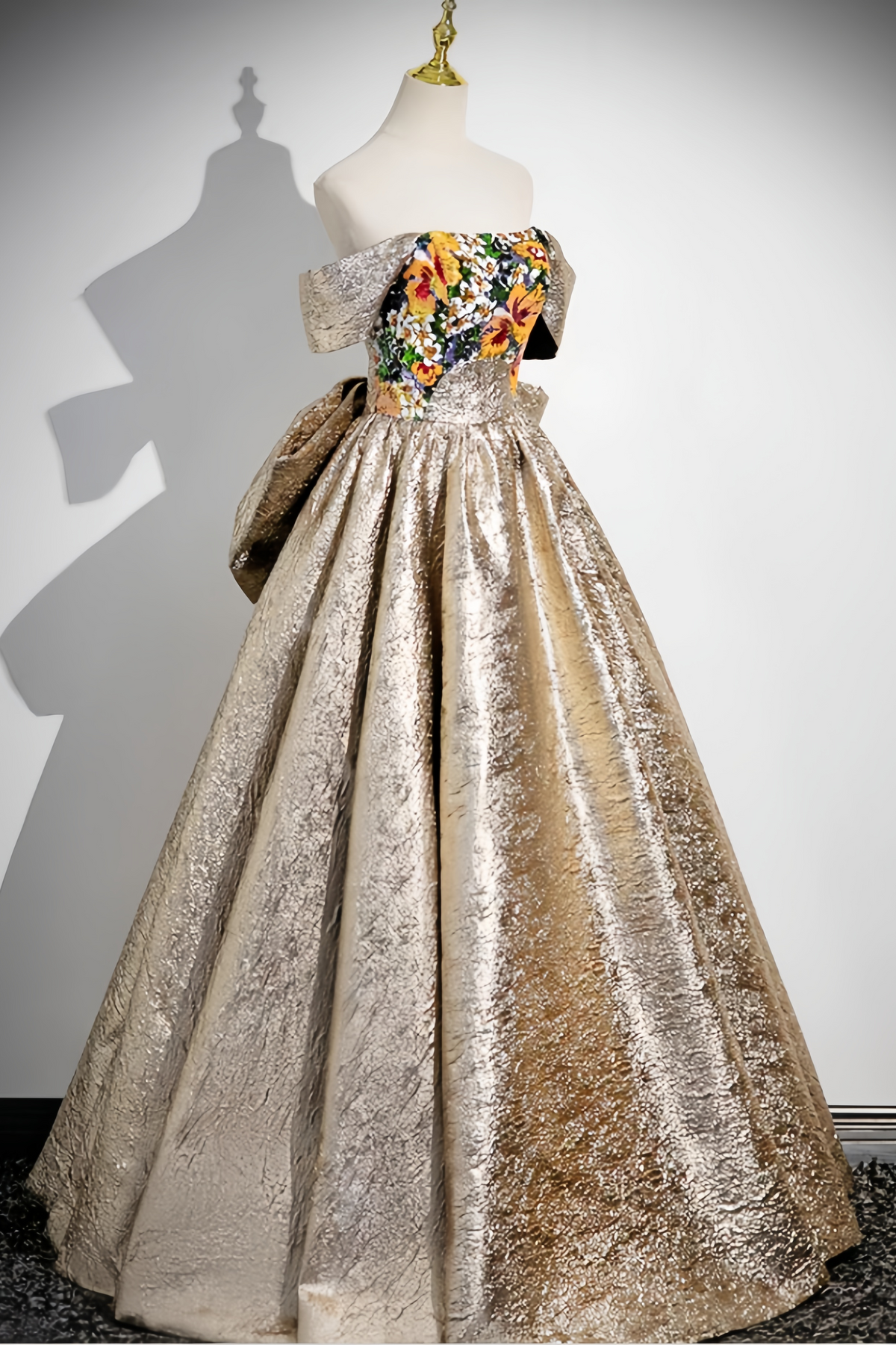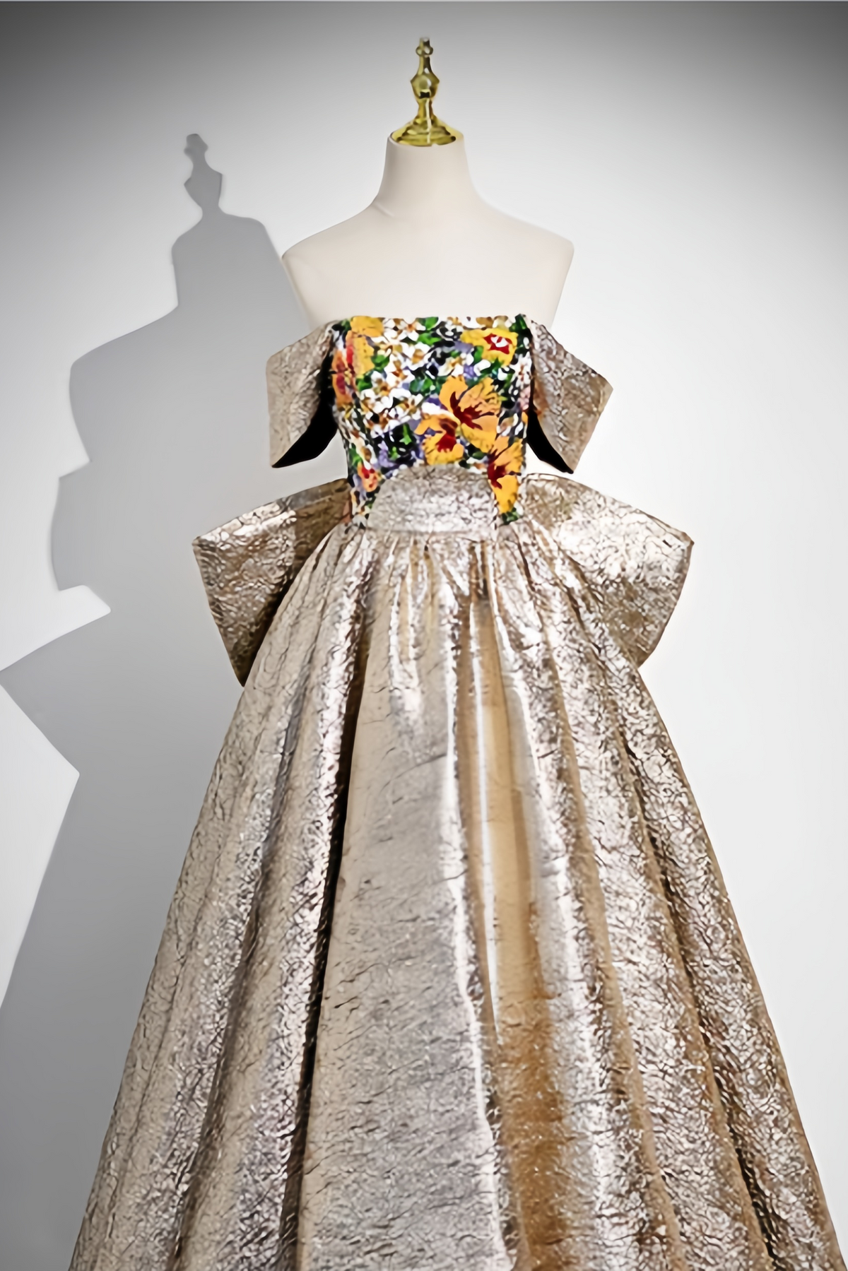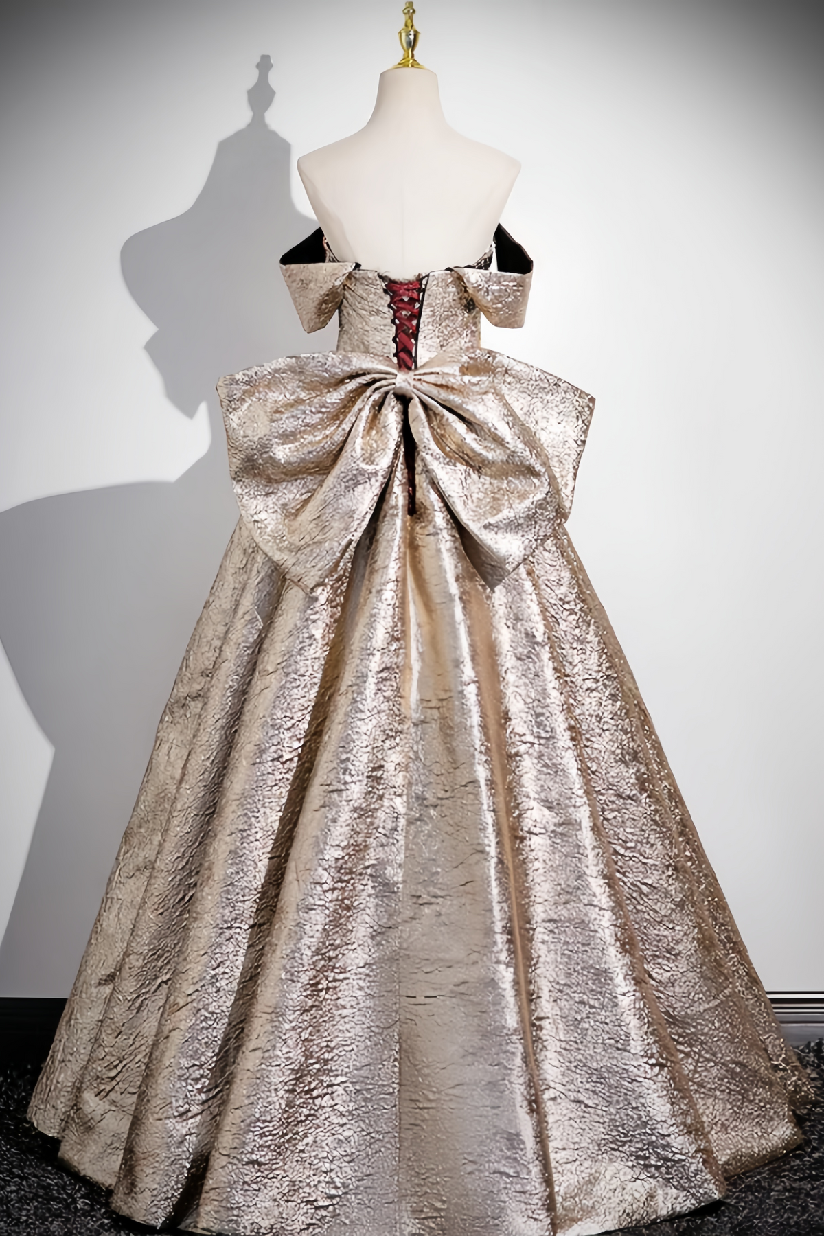 Champagne Sequin Bow Off-the-shoulder A-line Dress