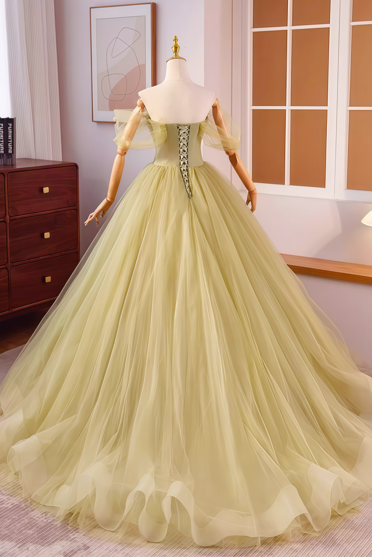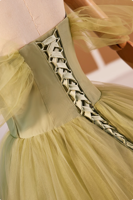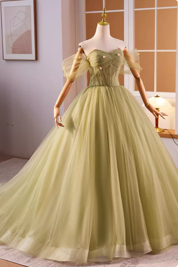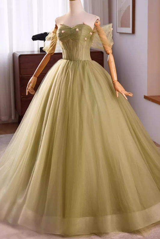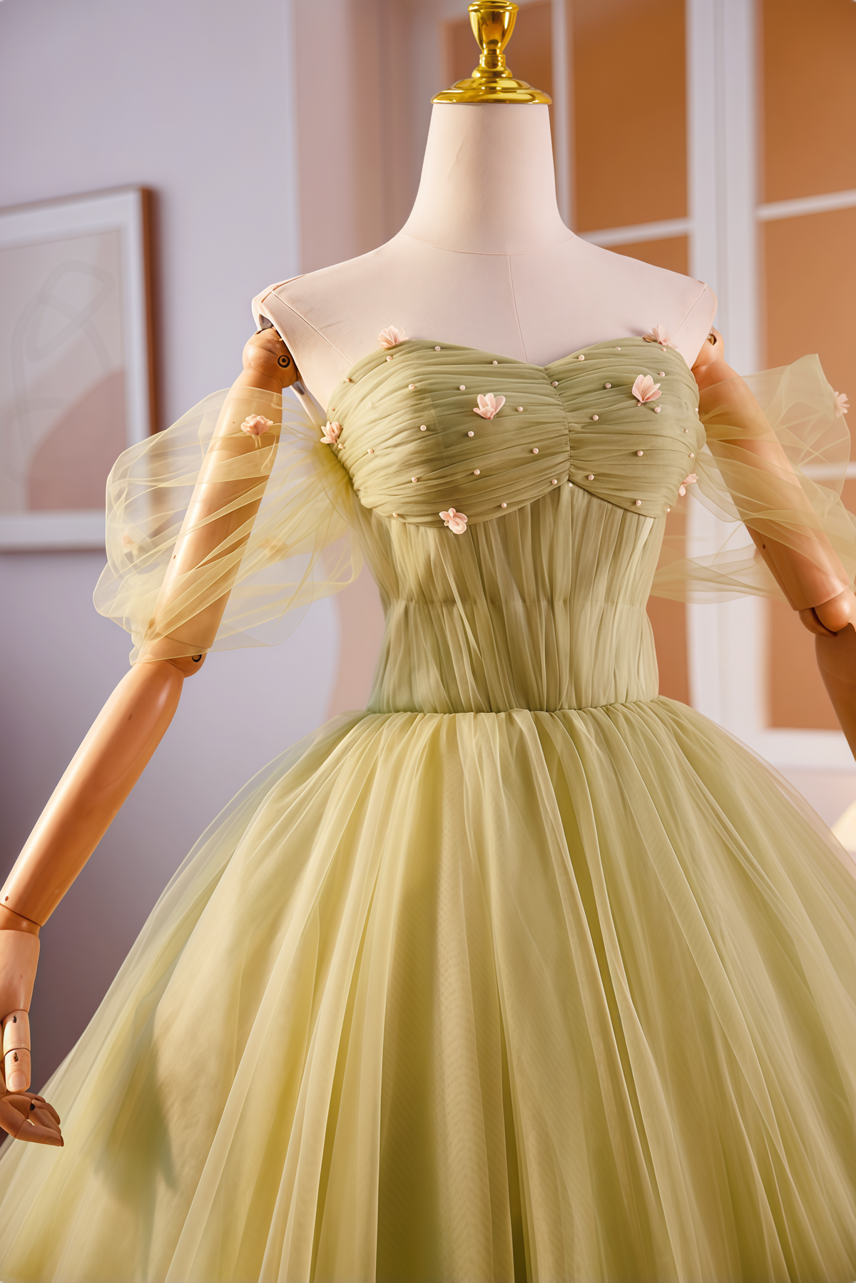 Crafted from tulle fabric in a green hue, this off-shoulder dress features an A-line shape with intricate beaded and 3D floral details throughout. It boasts a full-length hem, a lace-up closure, and a low back design, combining elegance with refined craftsmanship.