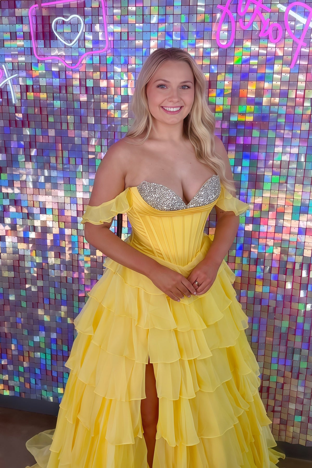 Crafted from chiffon fabric in a soft pink hue, this A-line gown features a beaded sweetheart neckline and off-shoulder design. It showcases a tiered ruffle hem, a full-length silhouette, and a low back for an elegant finish.