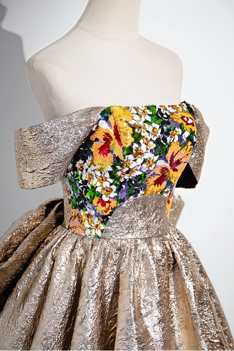 Champagne Sequin Bow Off-the-shoulder A-line Dress