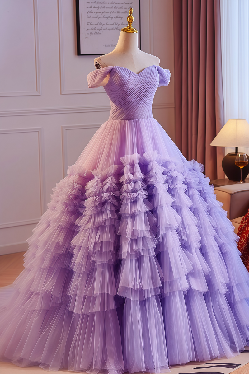 Lavender Soft Tulle Off the Shoulder Long Prom Dress