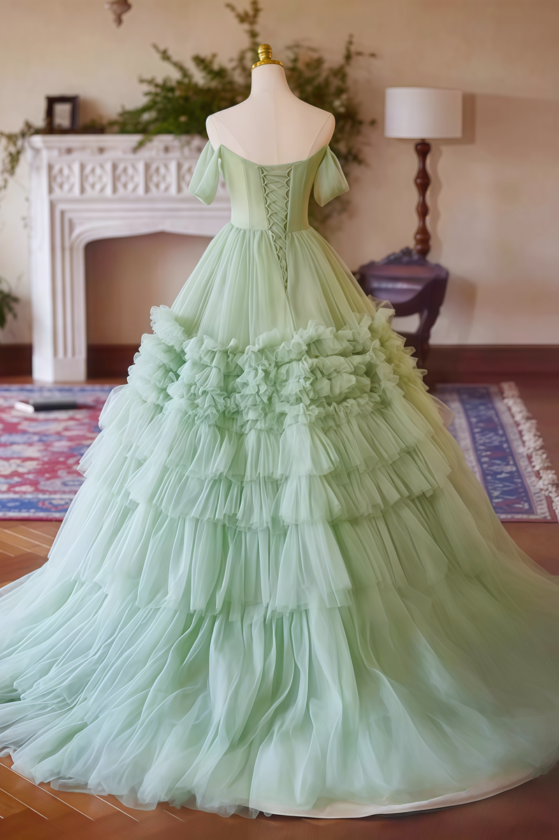 Off the Shoulder Green Tulle A-line Fairy Long Formal Dress
