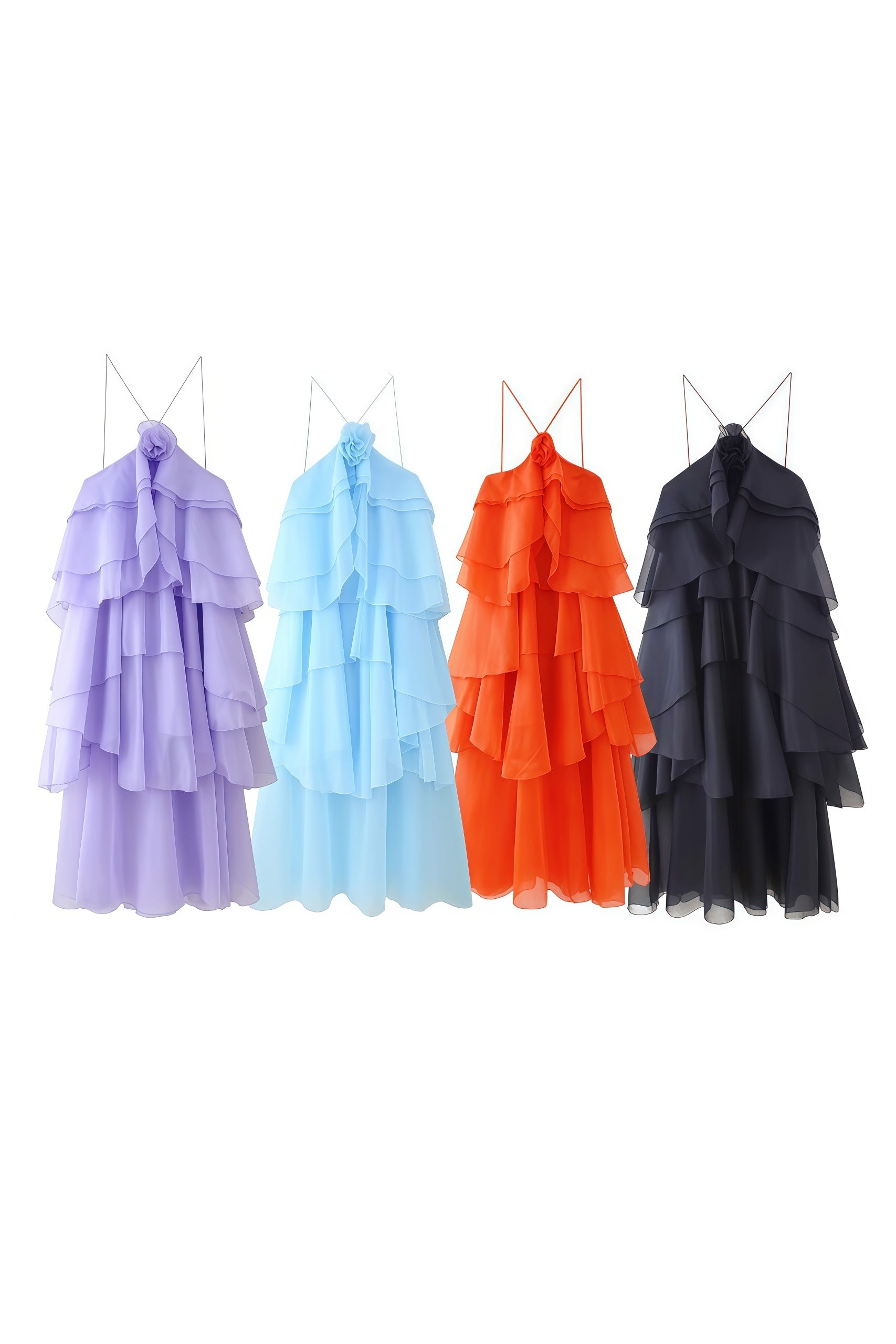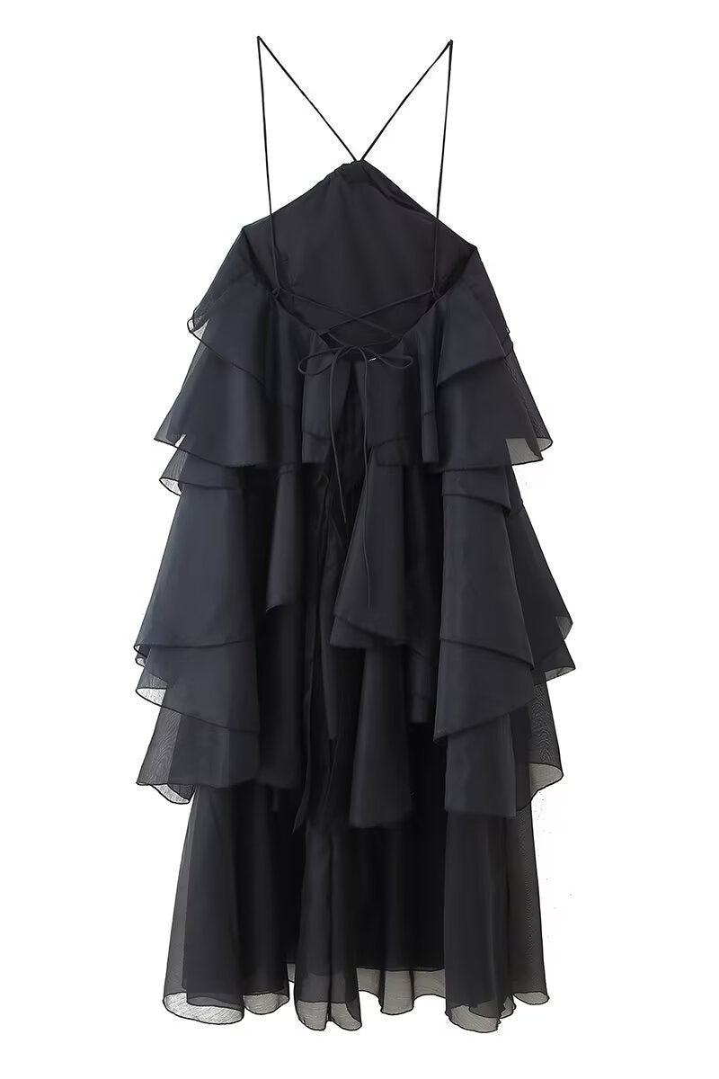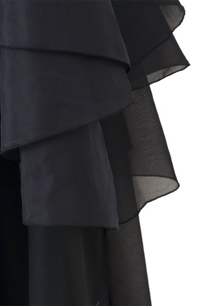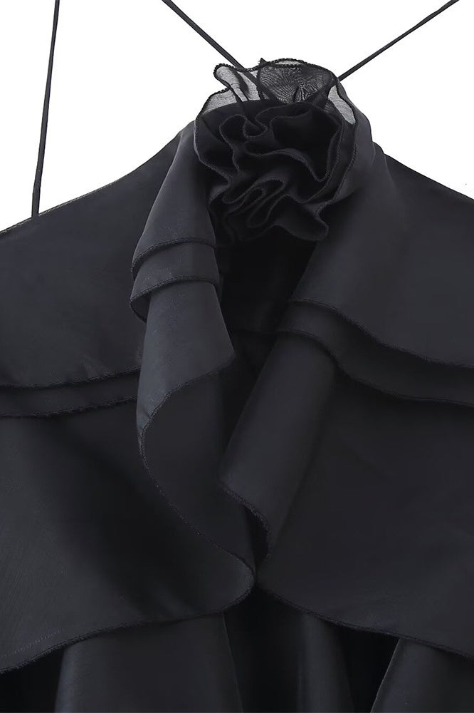 This long black dress features an A-line silhouette crafted from tulle fabric, highlighted by a V-neckline and delicate spaghetti straps. It showcases a layered ruffle design with 3D floral accents, a flowy hem, and an open back secured by a zip closure, combining elegance with intricate detailing.