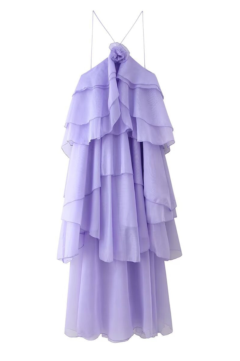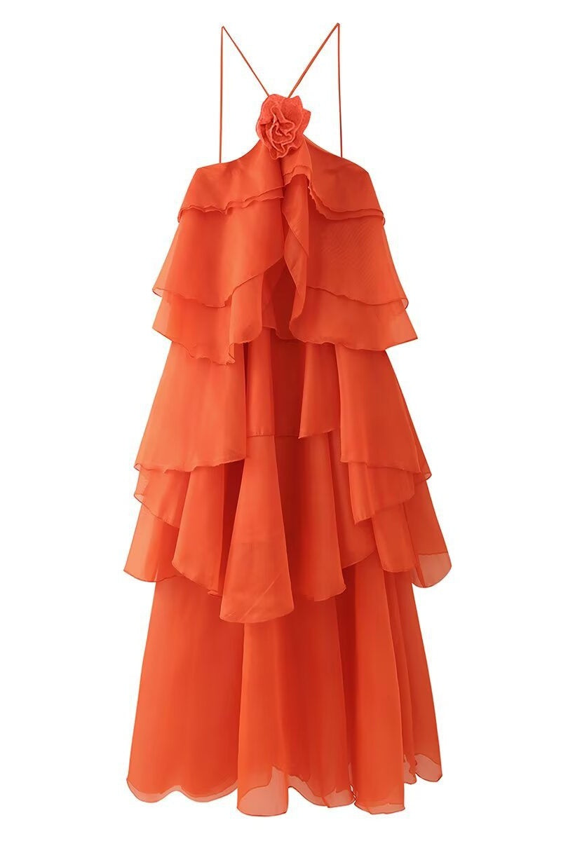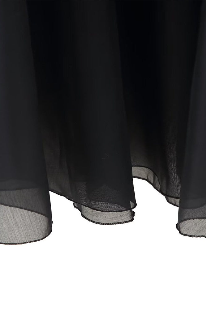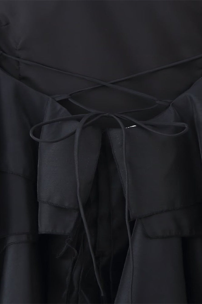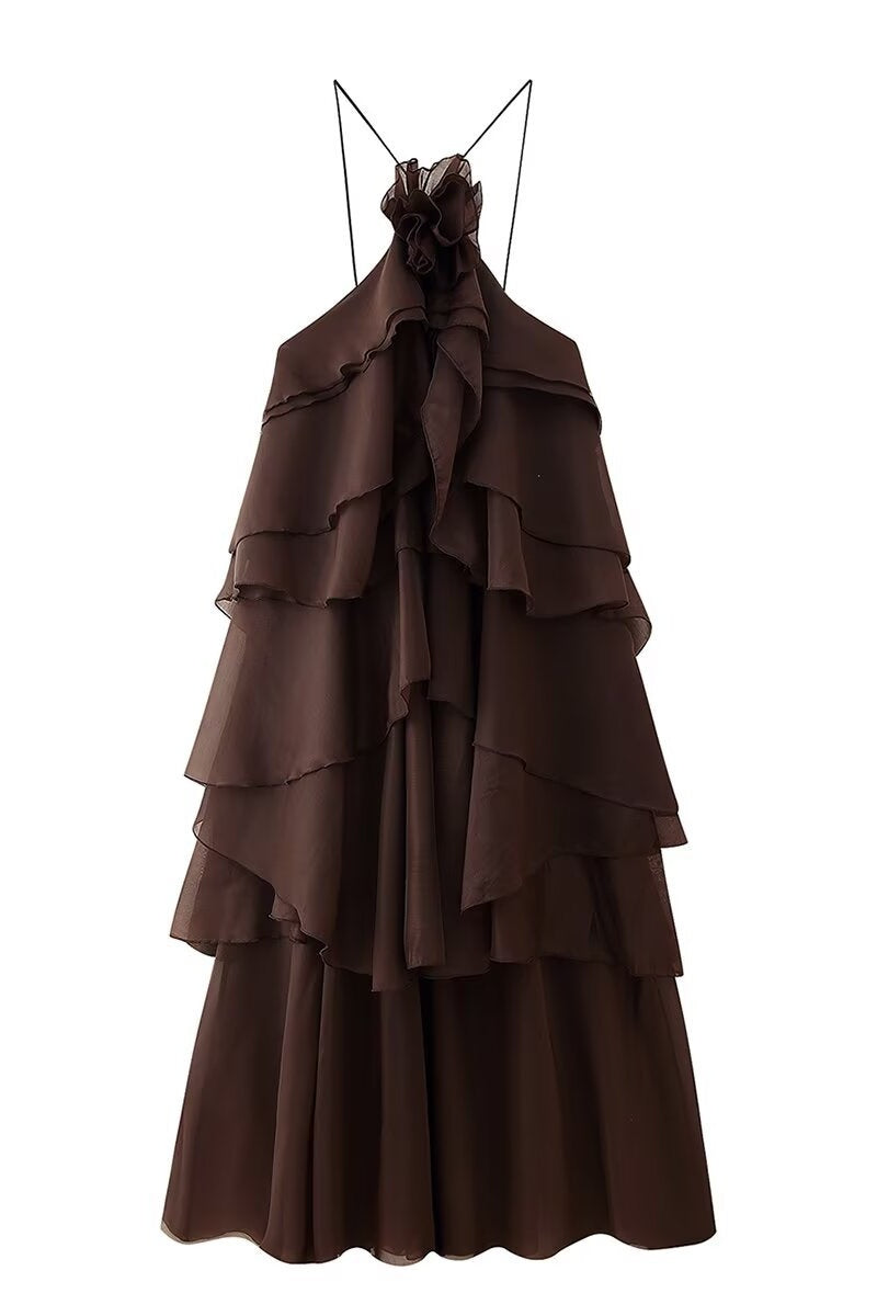 This long black dress features an A-line silhouette crafted from tulle fabric, highlighted by a V-neckline and delicate spaghetti straps. It showcases a layered ruffle design with 3D floral accents, a flowy hem, and an open back secured by a zip closure, combining elegance with intricate detailing.