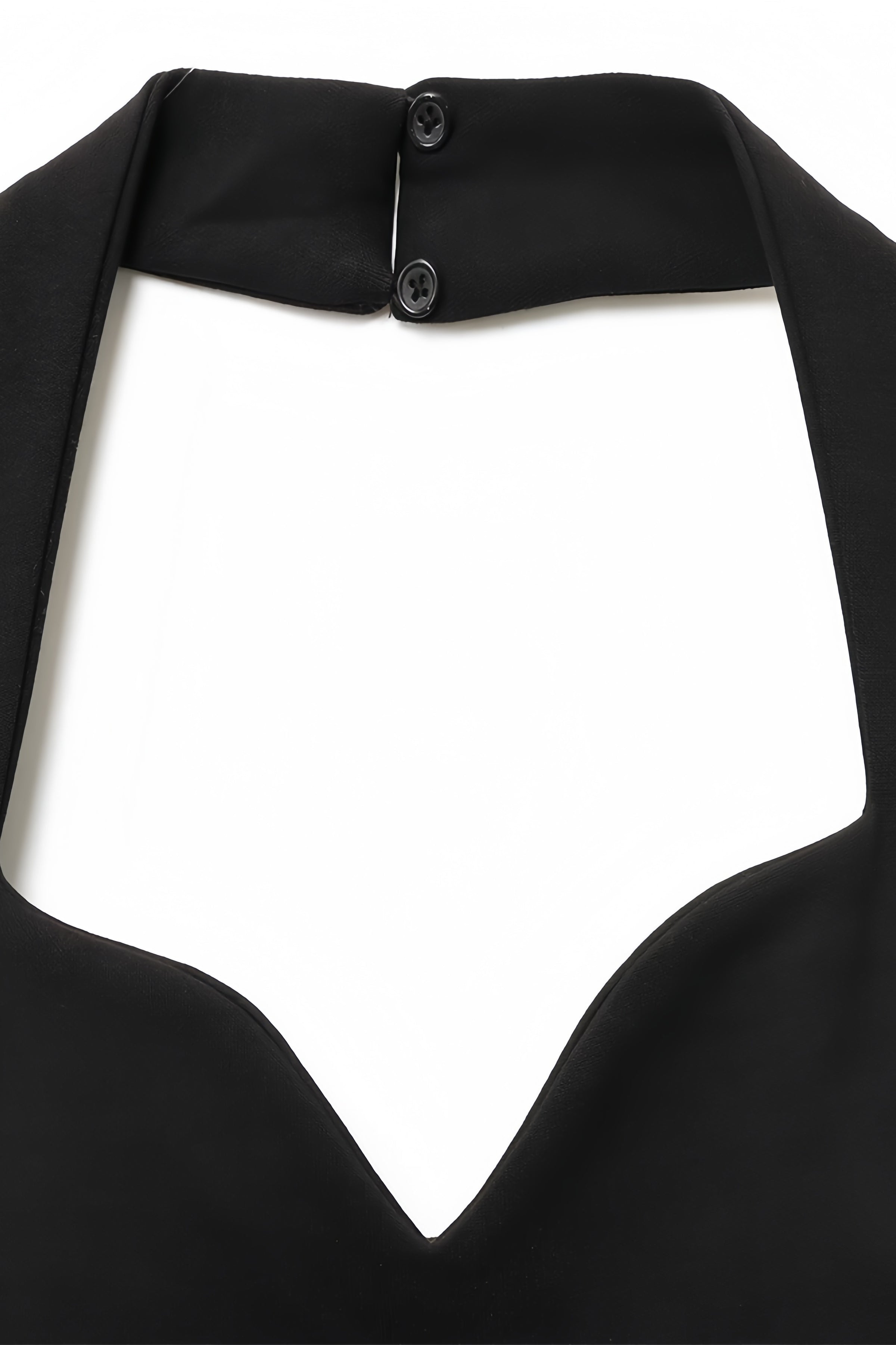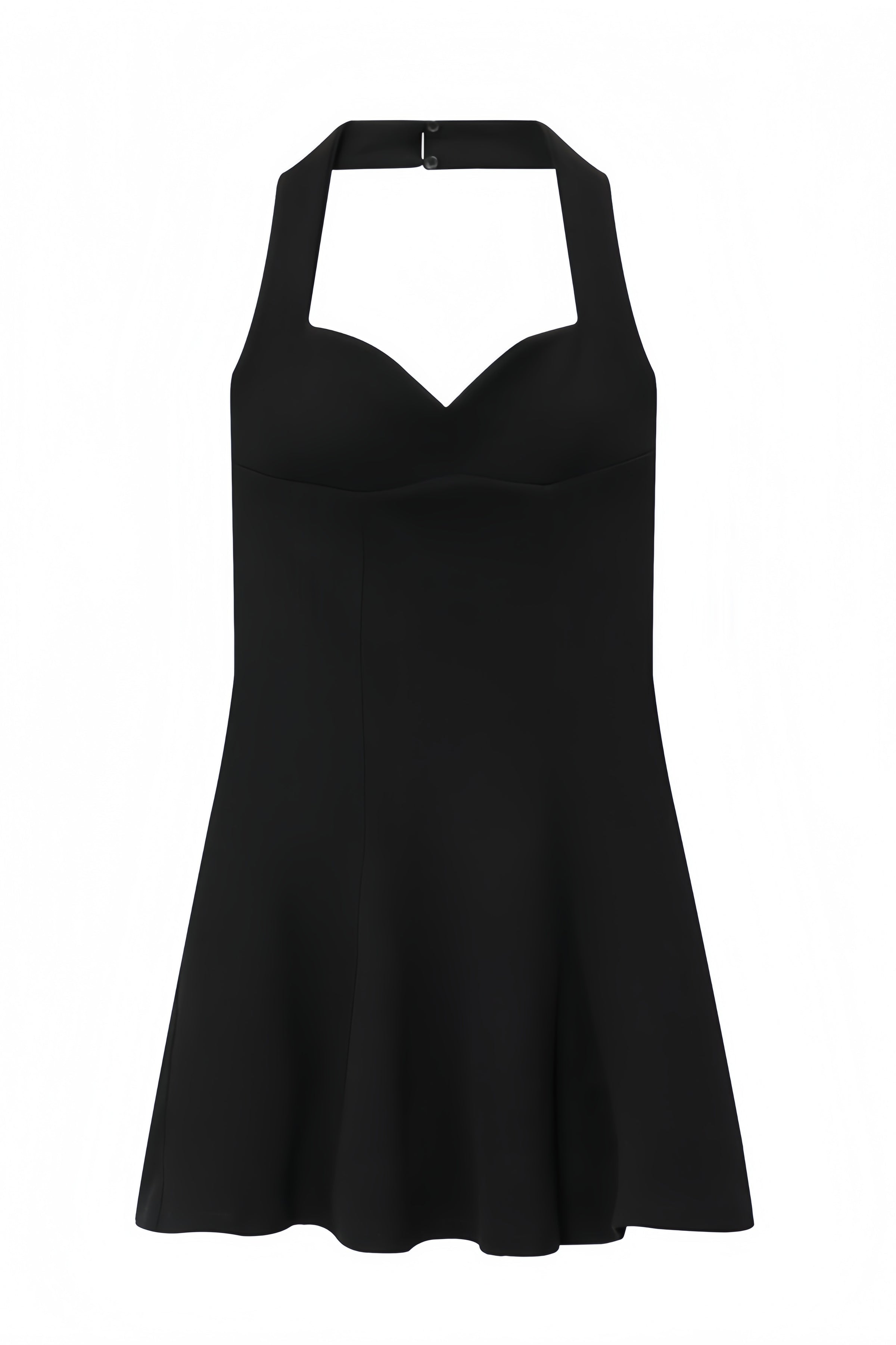 This black A-line dress is made from polyester and showcases a halter neckline with a ruffle hem. Designed with a low back, it offers a mini length silhouette for a stylish and flattering fit.