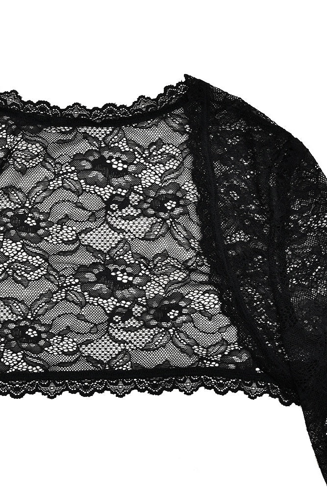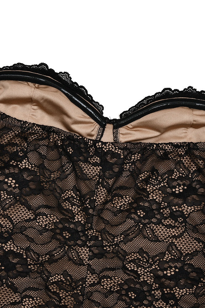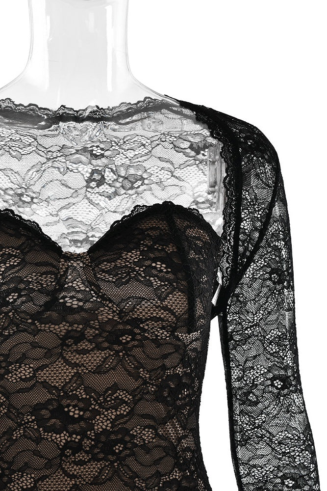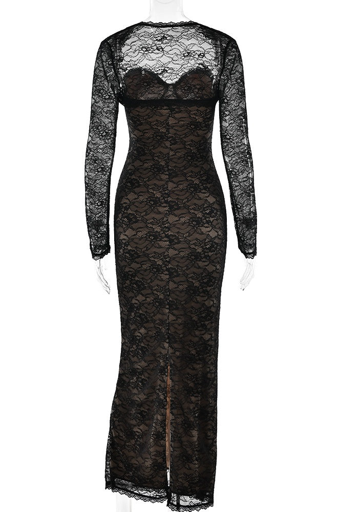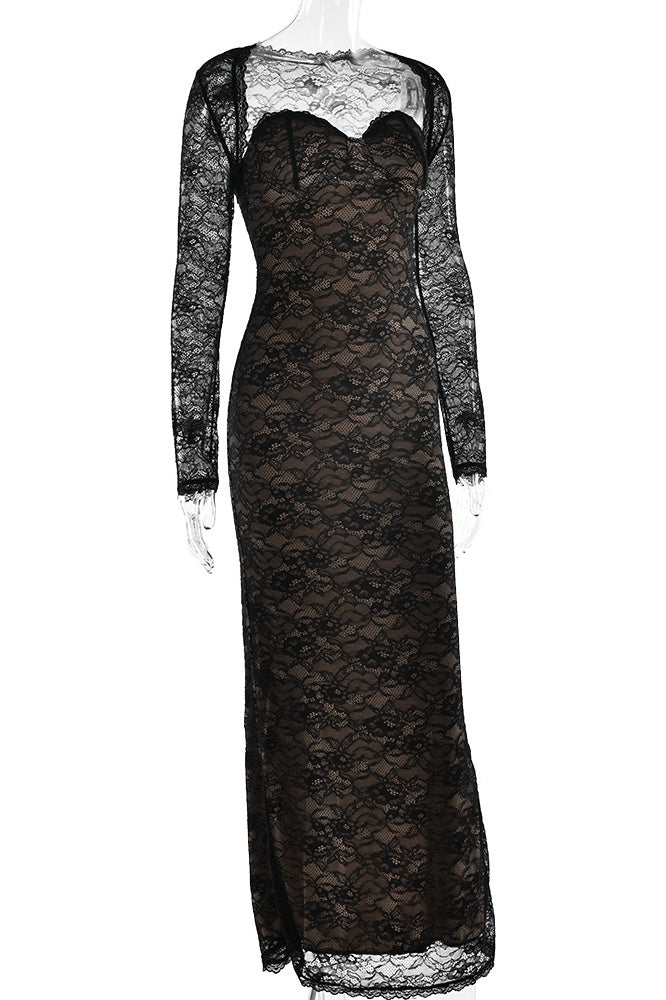 This two-piece set features lace print embroidery with a sweetheart neckline in black. The bodycon fit is complemented by long sleeves and a long-length design, finished with a low back for an elegant touch.