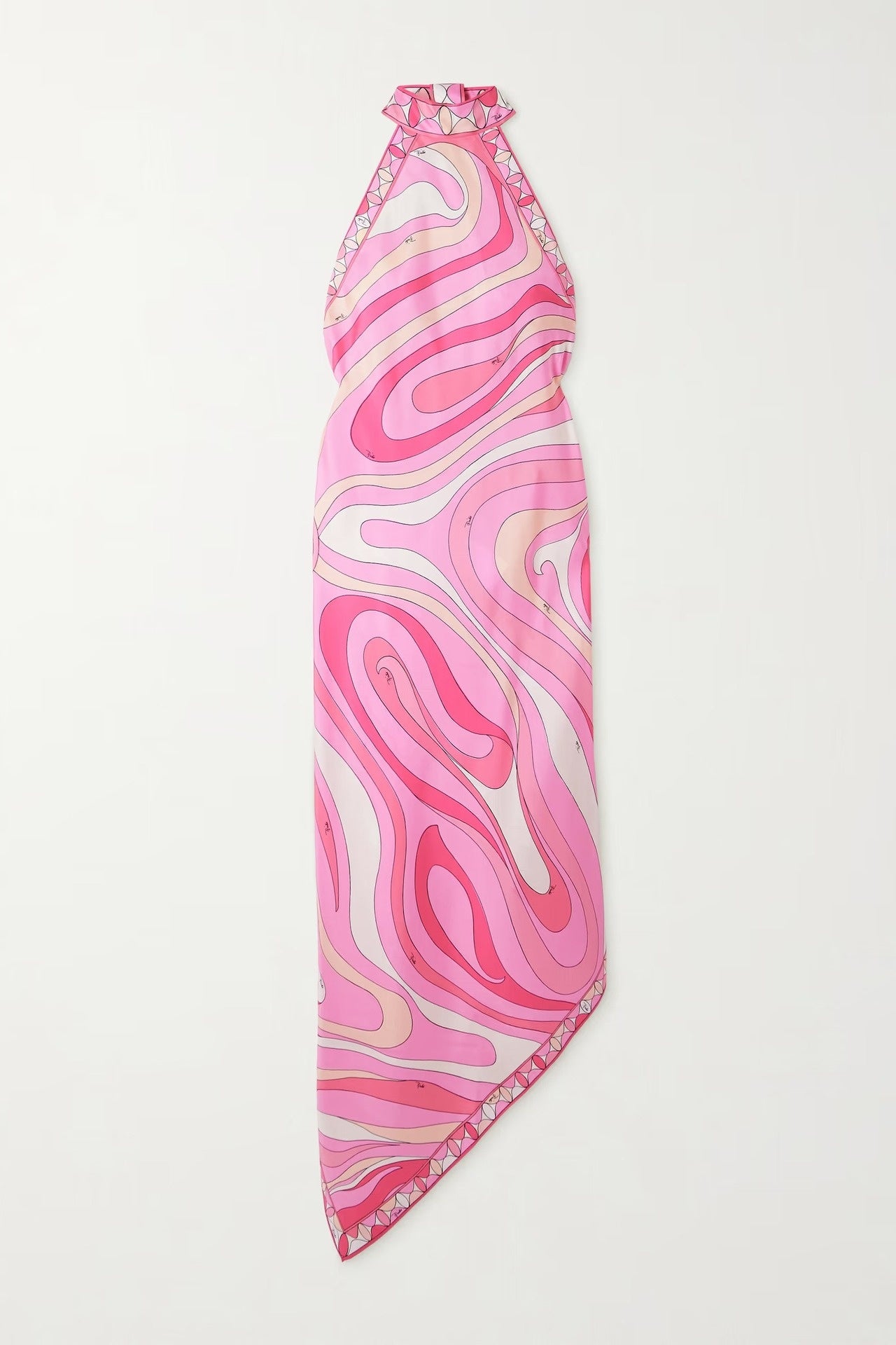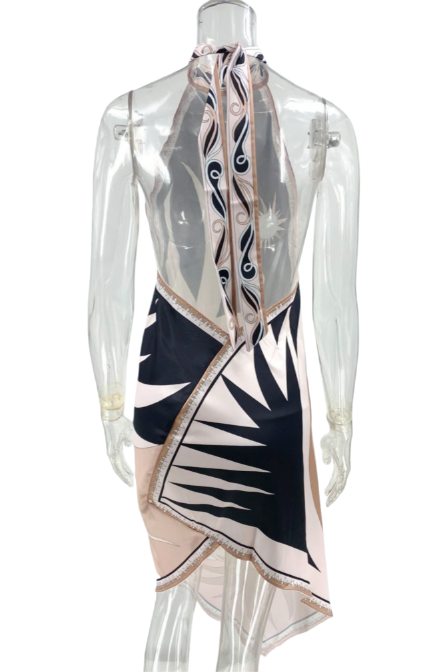 This satin black dress features a printed pattern with a halter neck tie and an asymmetrical hem. Designed as a long dress, it showcases an open back for an elegant and distinctive look.