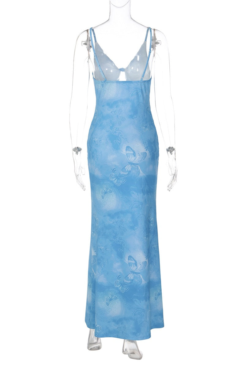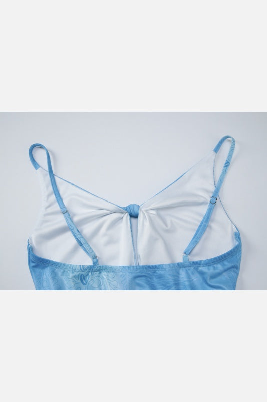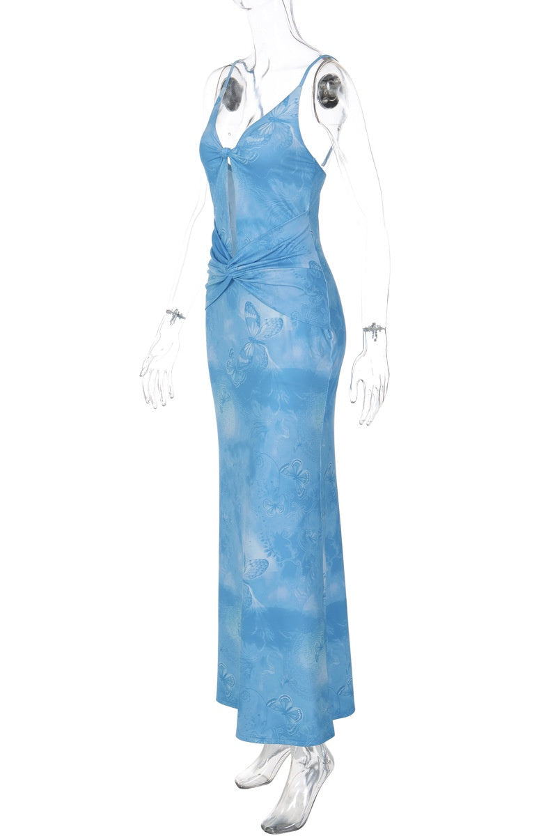 Blue Print Spaghetti Straps Cut-out Long Dress