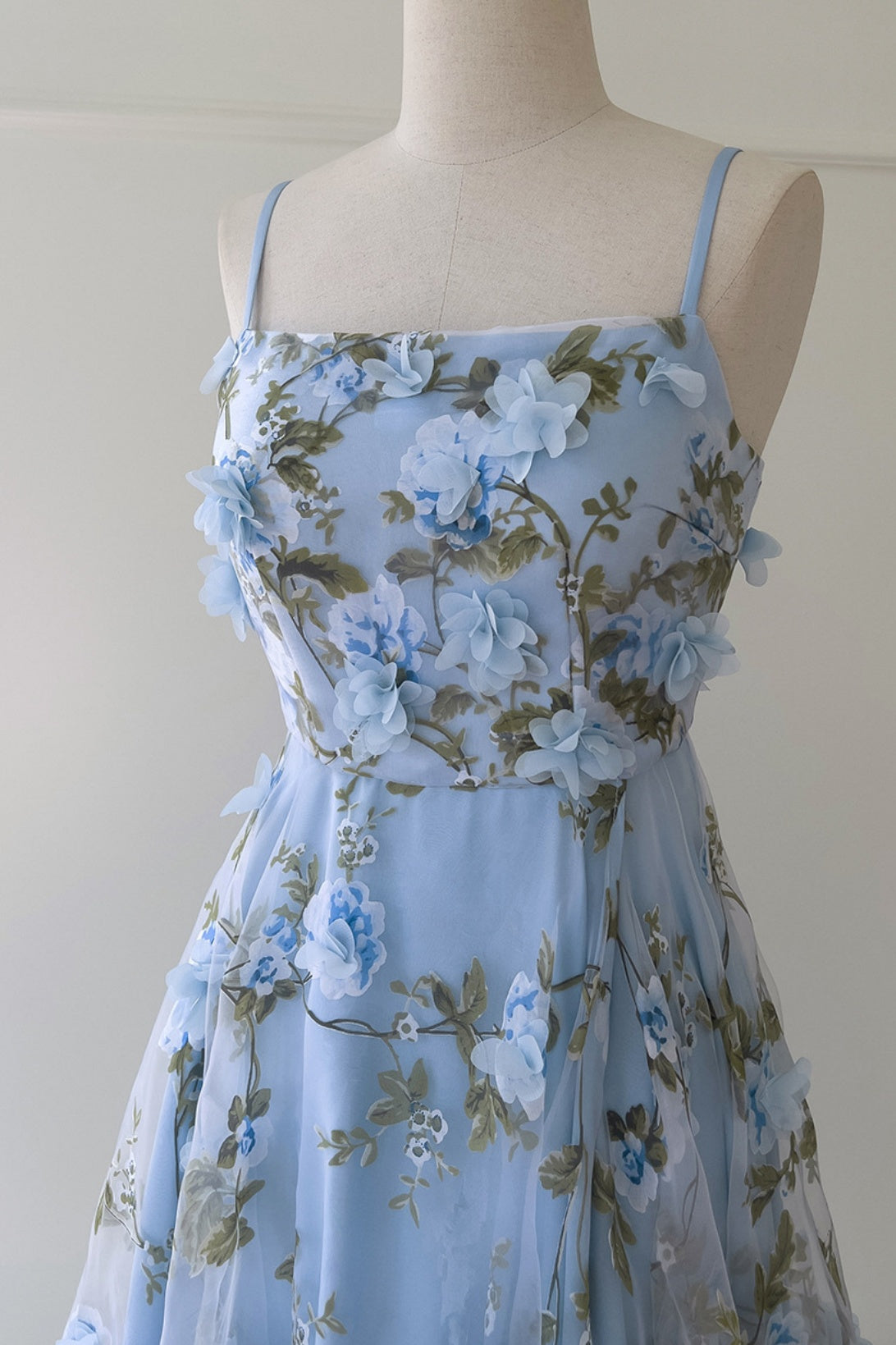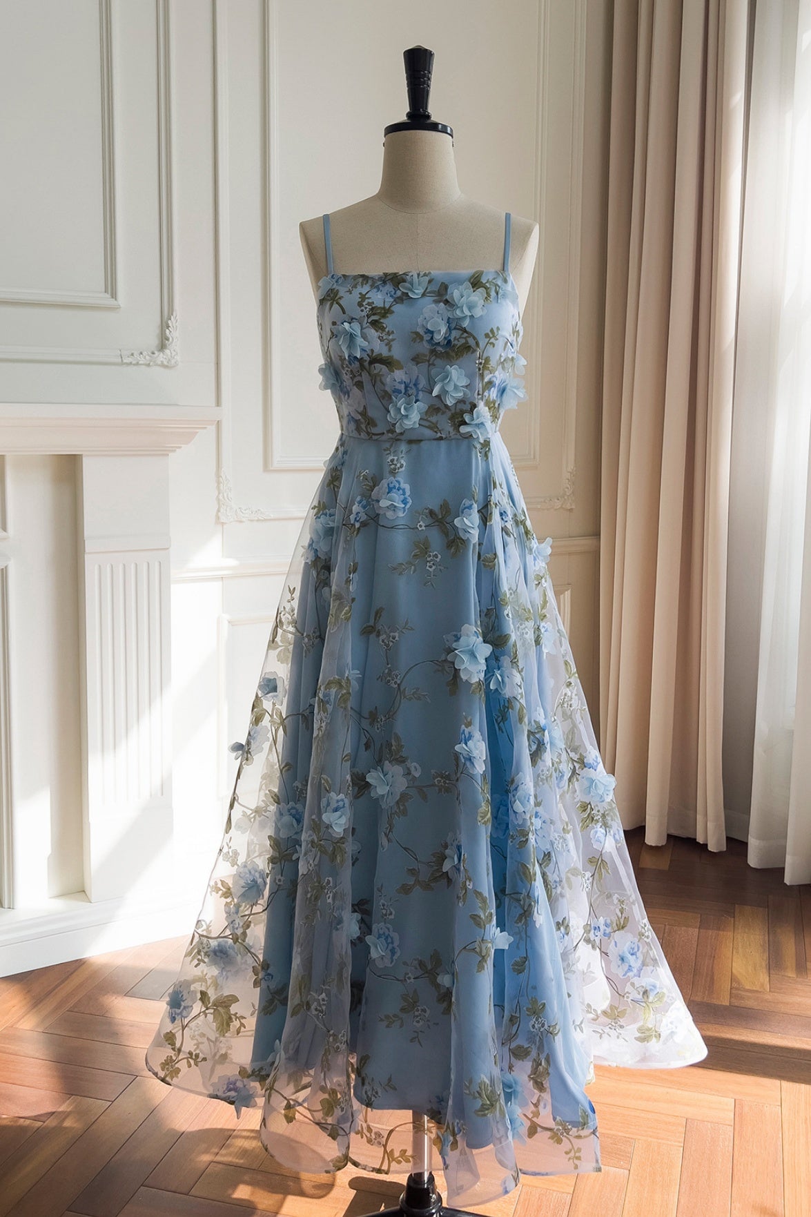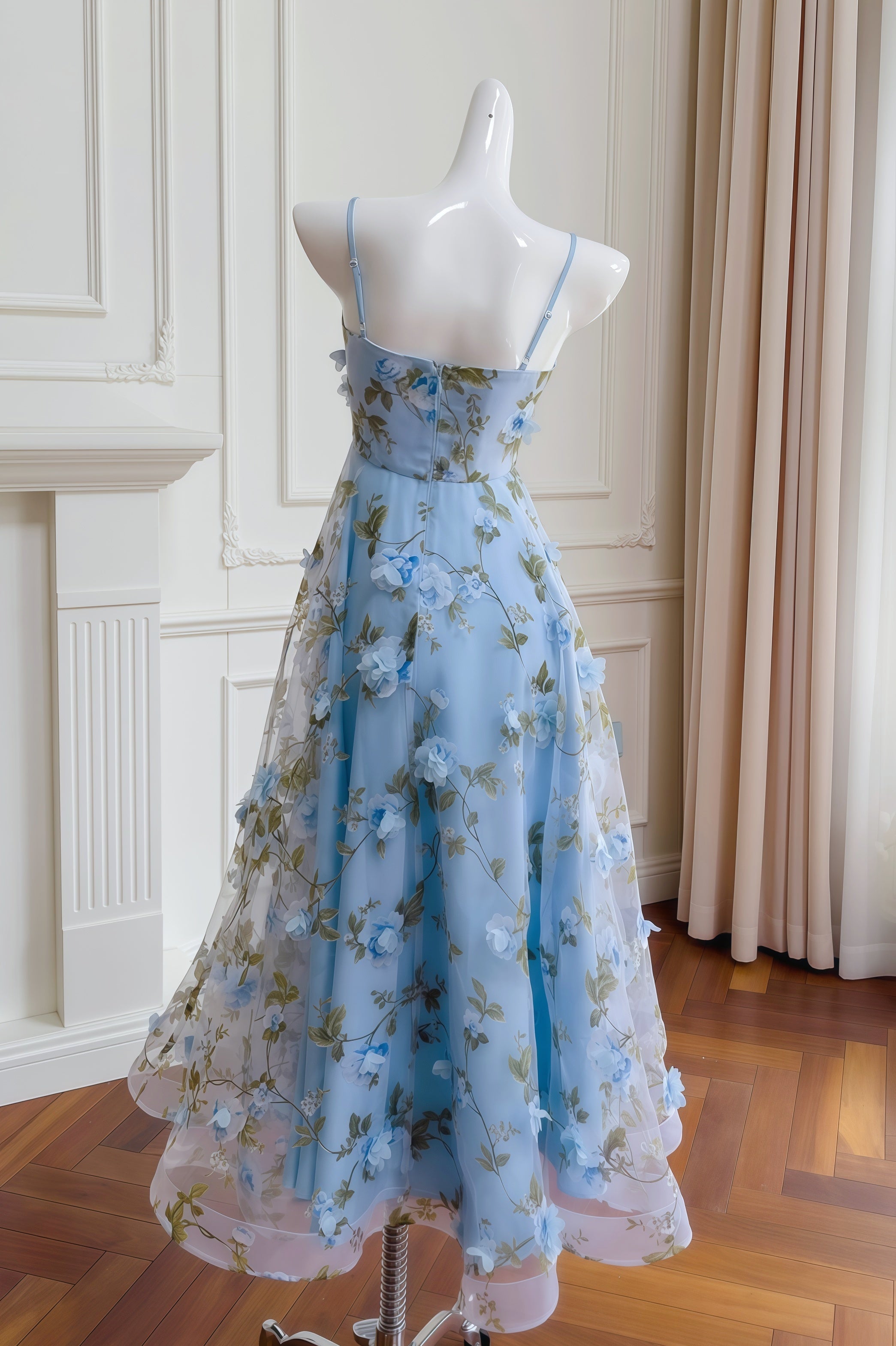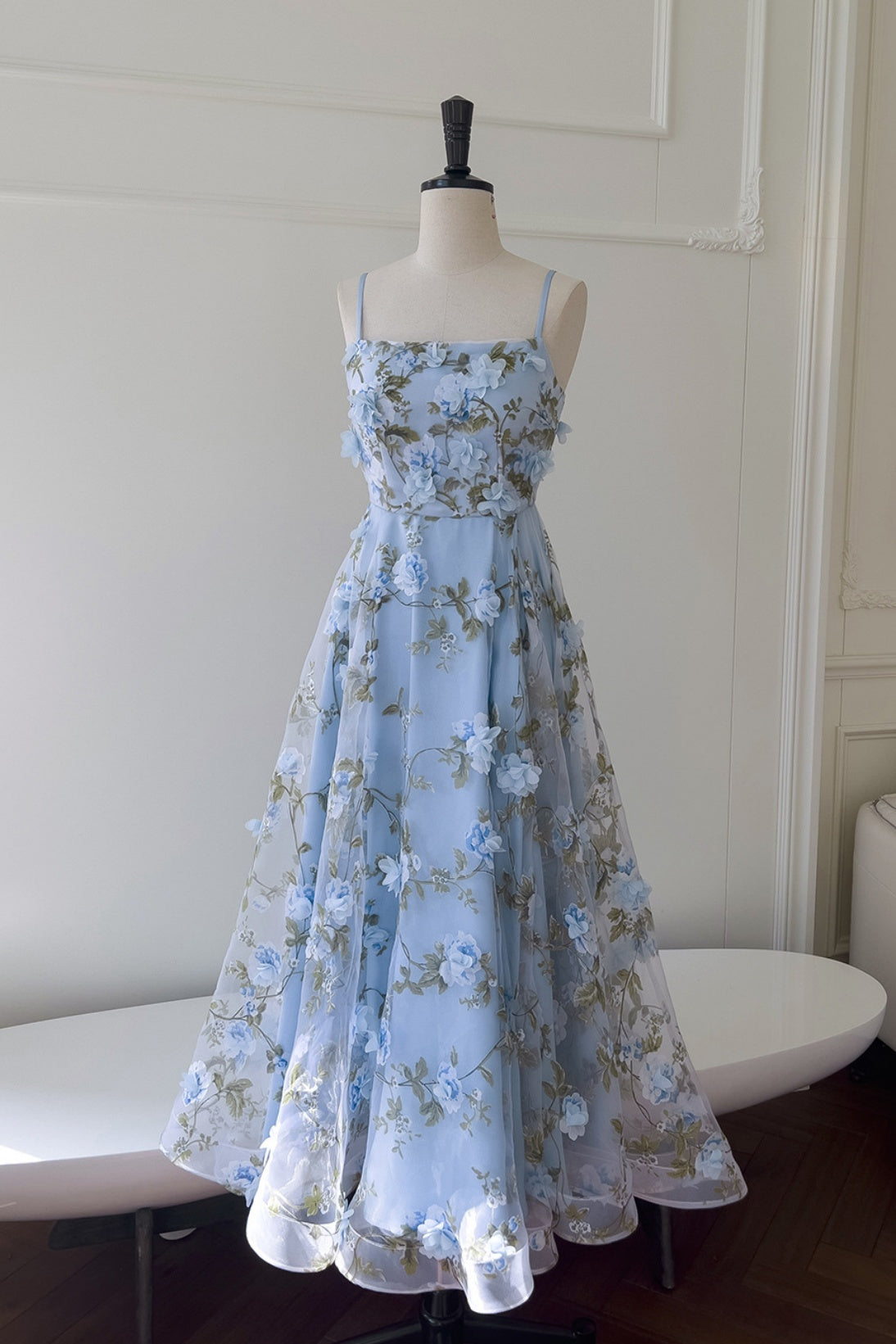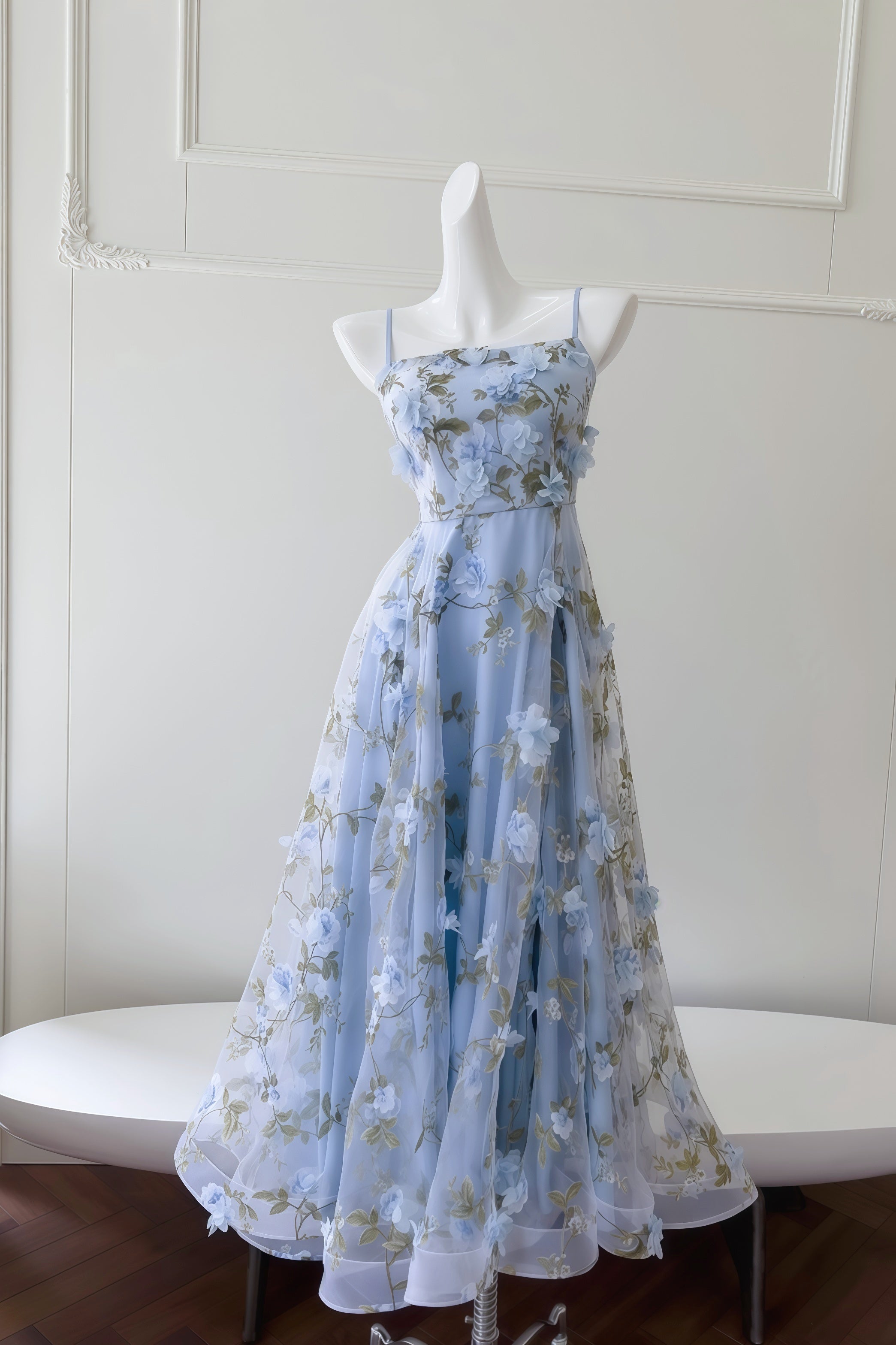 Blue Spaghetti Straps 3D Floral Long Dress