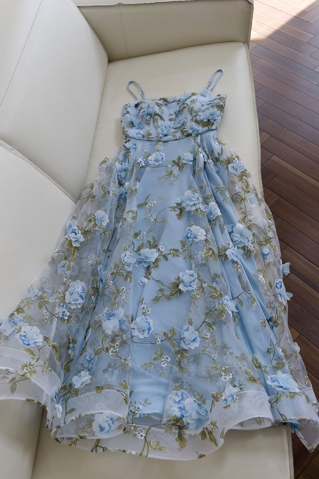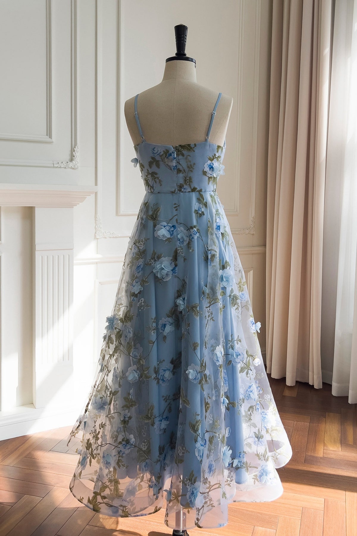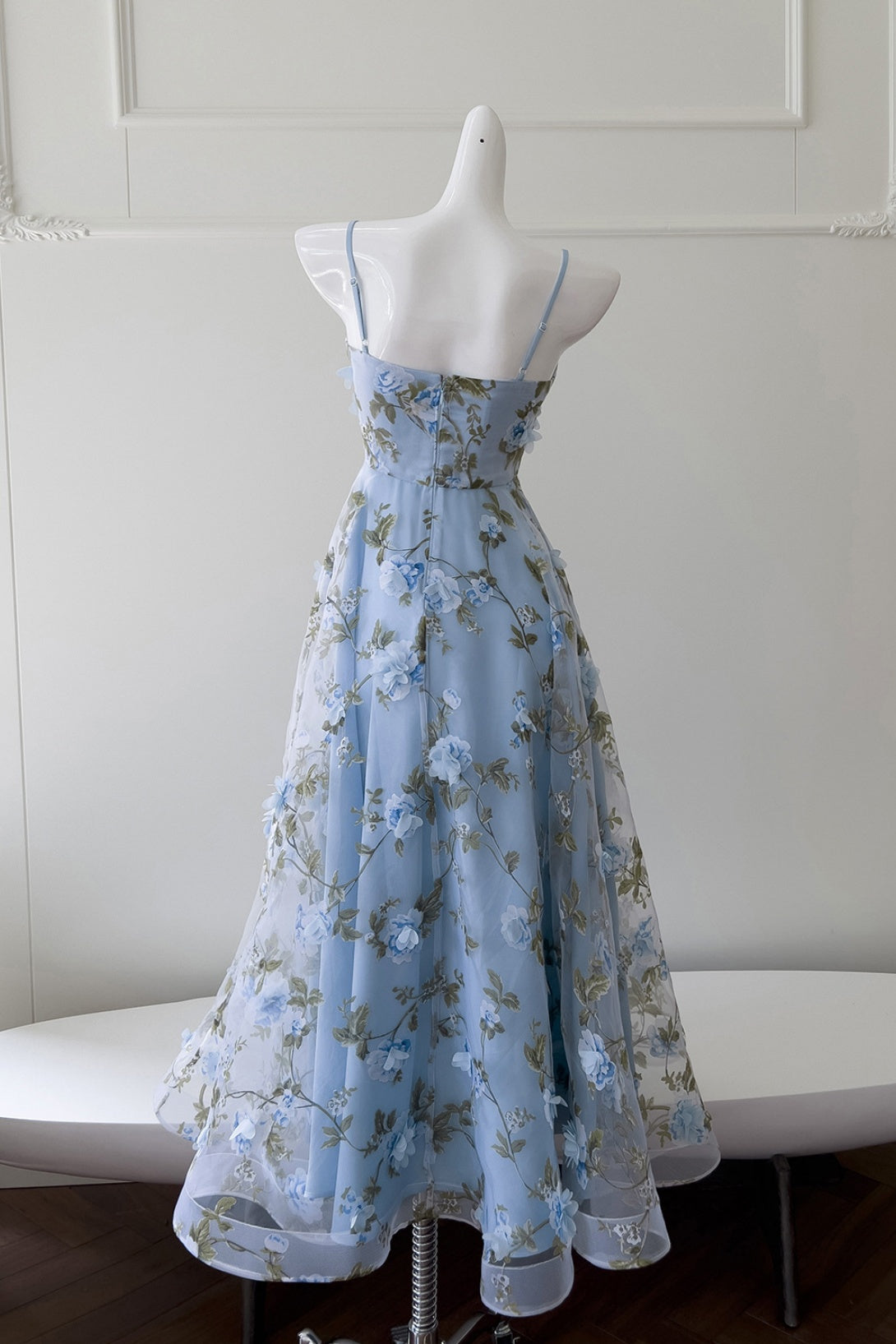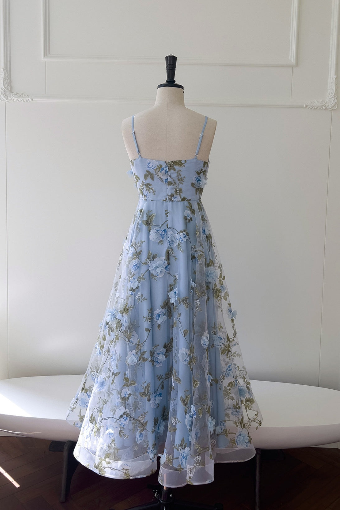 Blue Spaghetti Straps 3D Floral Long Dress