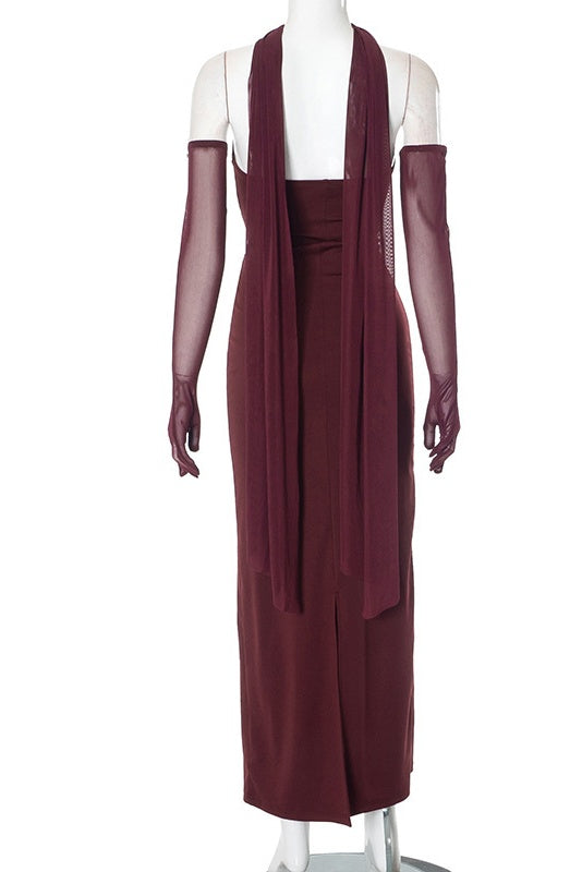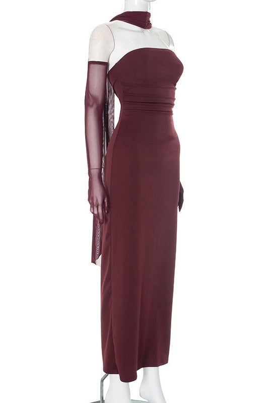 Crafted from polyester fiber, this burgundy tube top bodycon dress features a flowy hem with delicate pleating. Its ruched design and stretchy fabric ensure a flattering fit, extending gracefully to floor length for an elegant silhouette.
