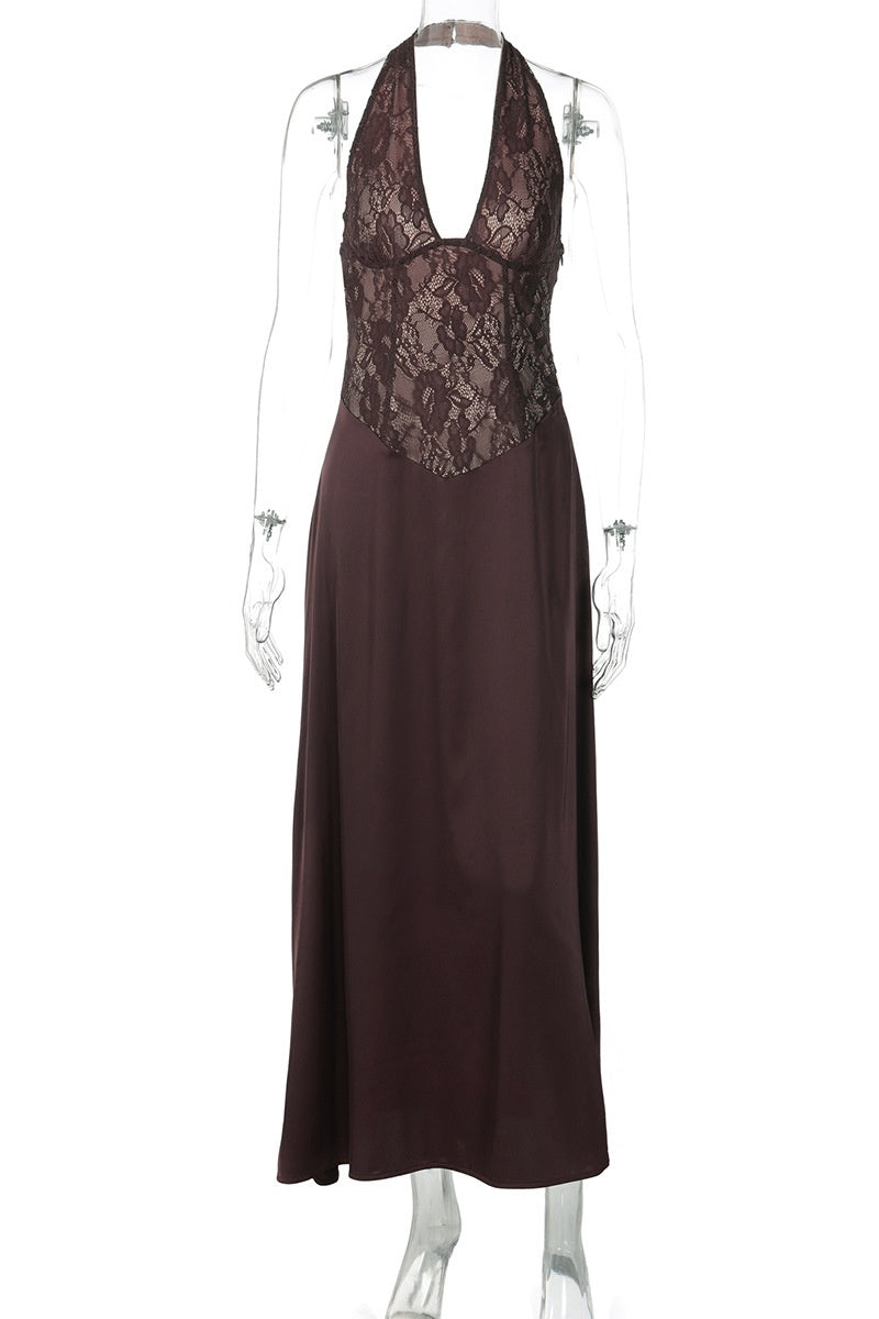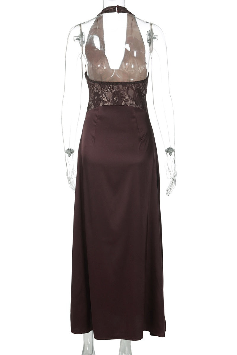 Brown satin dress with lace-print panels and A-line silhouette. Features a halter V-neckline, low back, and side zipper closure. Long length design ideal for formal events and evening wear.