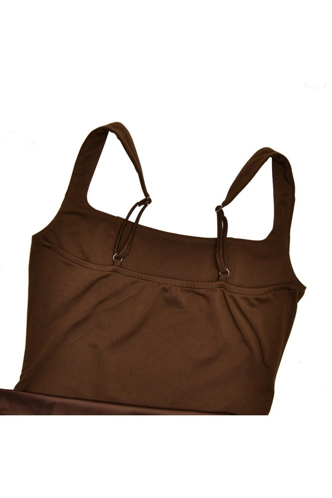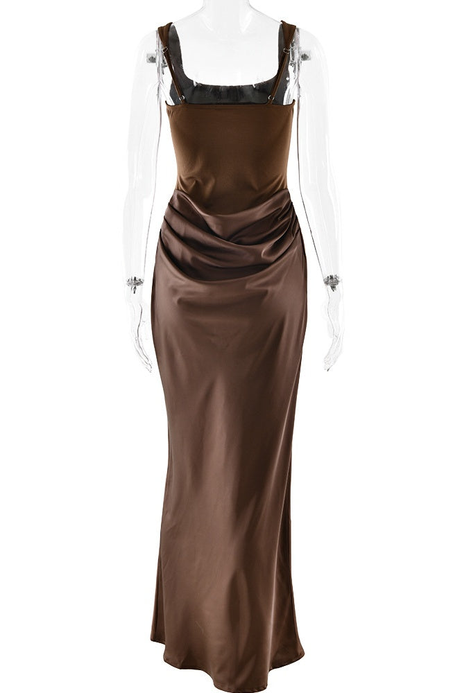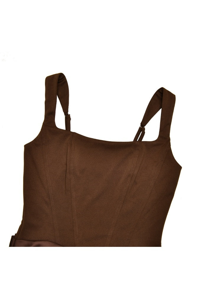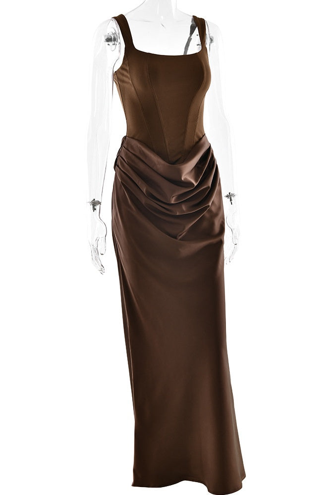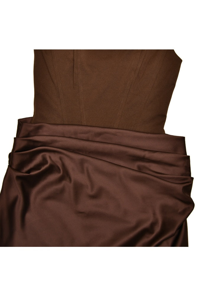 Brown strapless long dress with a sweetheart neckline and elegant low back. Features a flattering A-line cut with draped waist detailing and mixed satin-polyester fabric for a refined finish.