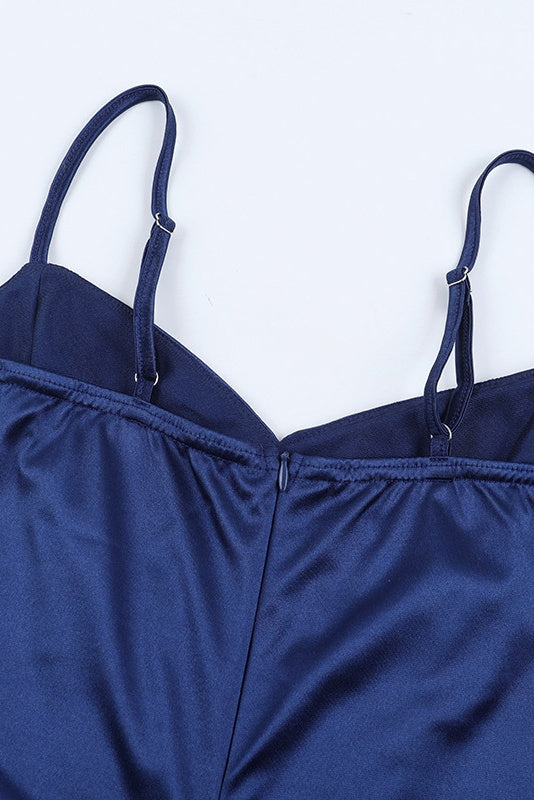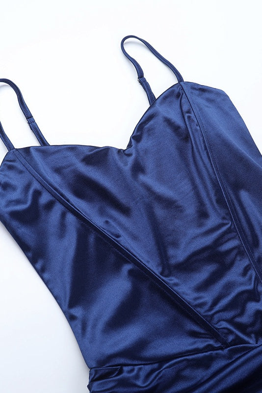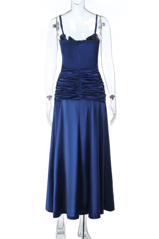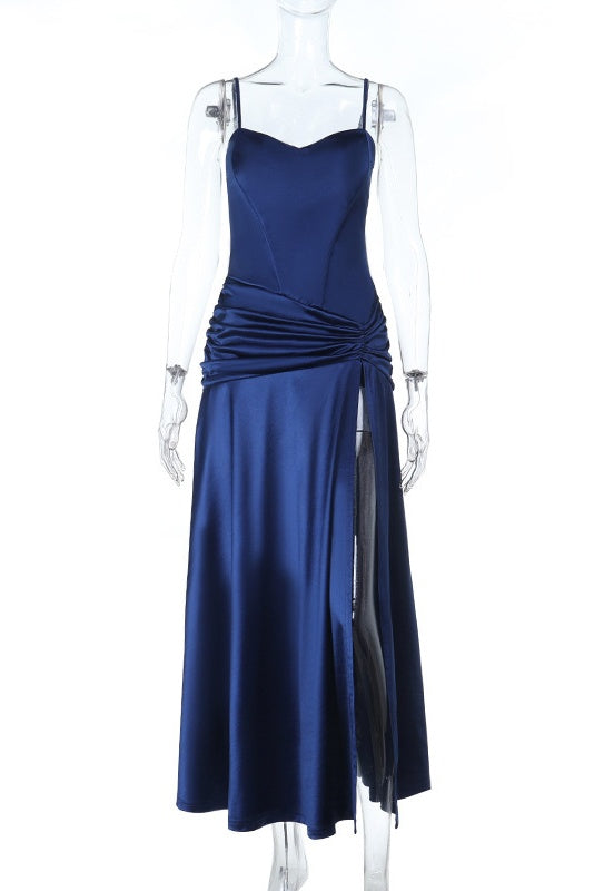 dThis navy blue A-line maxi dress is crafted from polyester fiber, featuring delicate spaghetti straps and a pleated design. It includes a high side slit and a zip-up back for a sleek fit, while the flowy hem adds graceful movement.