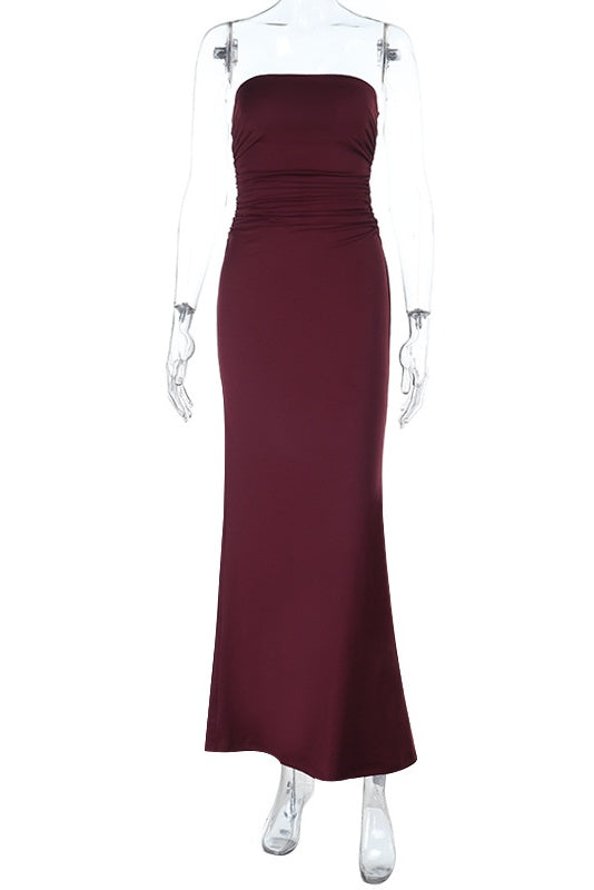 This maxi dress features a burgundy polyester fiber fabric with a bodycon fit, spaghetti straps, and a pleated design. It includes a high side slit, elastic detailing, and a low back for an elegant and sophisticated silhouette.