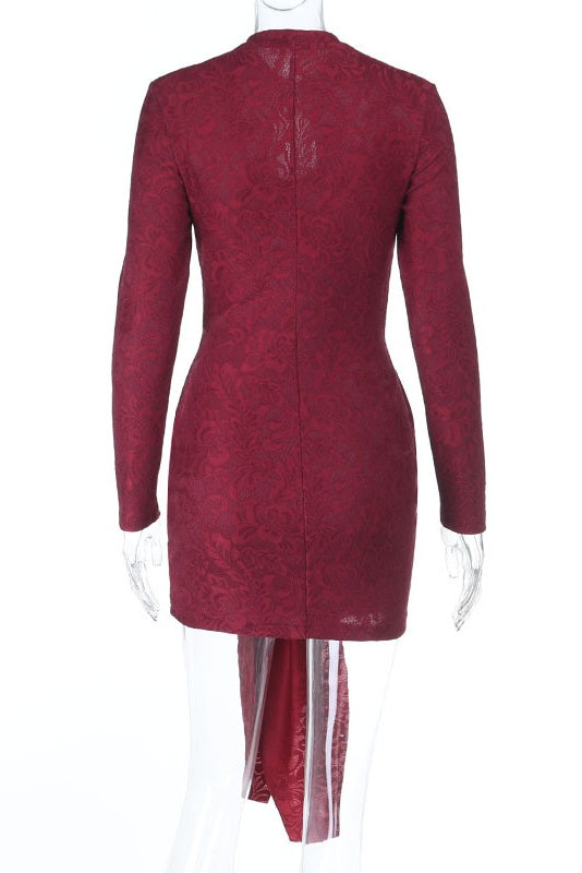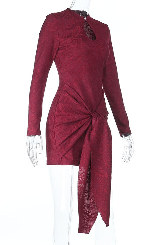 This burgundy lace dress features a high neckline and an A-line silhouette. It includes a hollowed chest detail, a tied hem on the skirt, and full-length sleeves with textured fabric. The pullover mini dress combines elegant design with intricate craftsmanship.