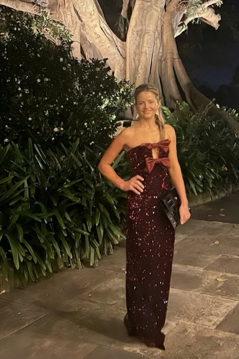 Stunning burgundy sequin gown with a strapless neckline and fitted silhouette. Features elegant satin bow accents, front cutout detail, and a dramatic back slit. Side zipper for easy wear. Ideal for formal events and celebrations.