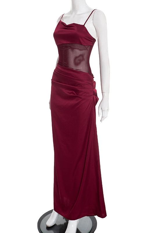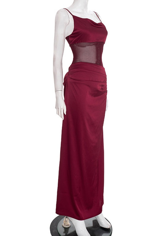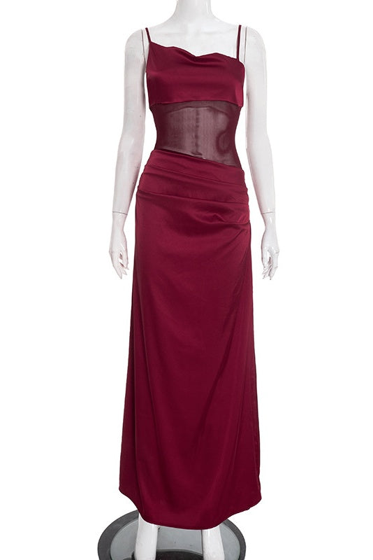 Elegant satin A-line dress featuring a distinctive cowl asymmetrical neckline and adjustable spaghetti straps. The mesh-paneled waist adds refined detail to this long silhouette, perfect for formal occasions.