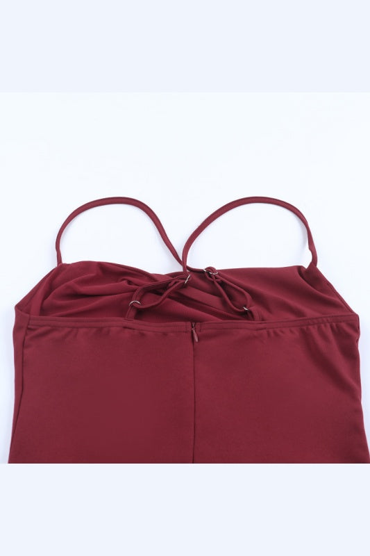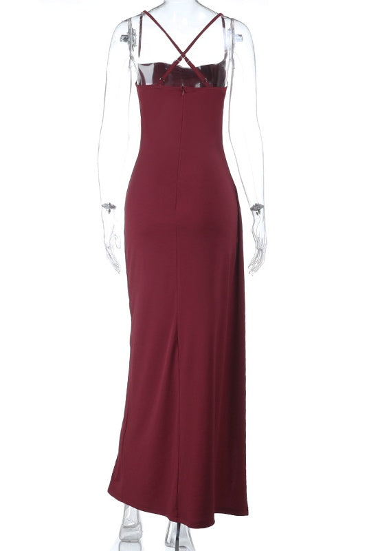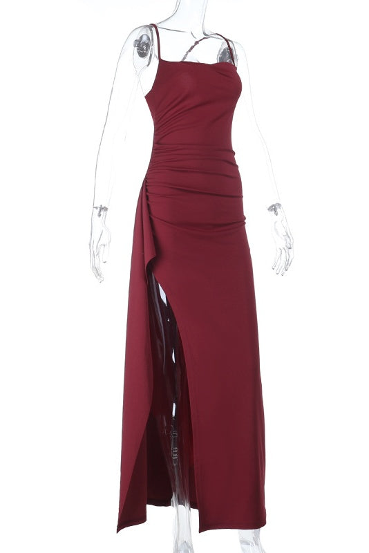 Burgundy Spaghetti Straps Ruffle Slit Dress