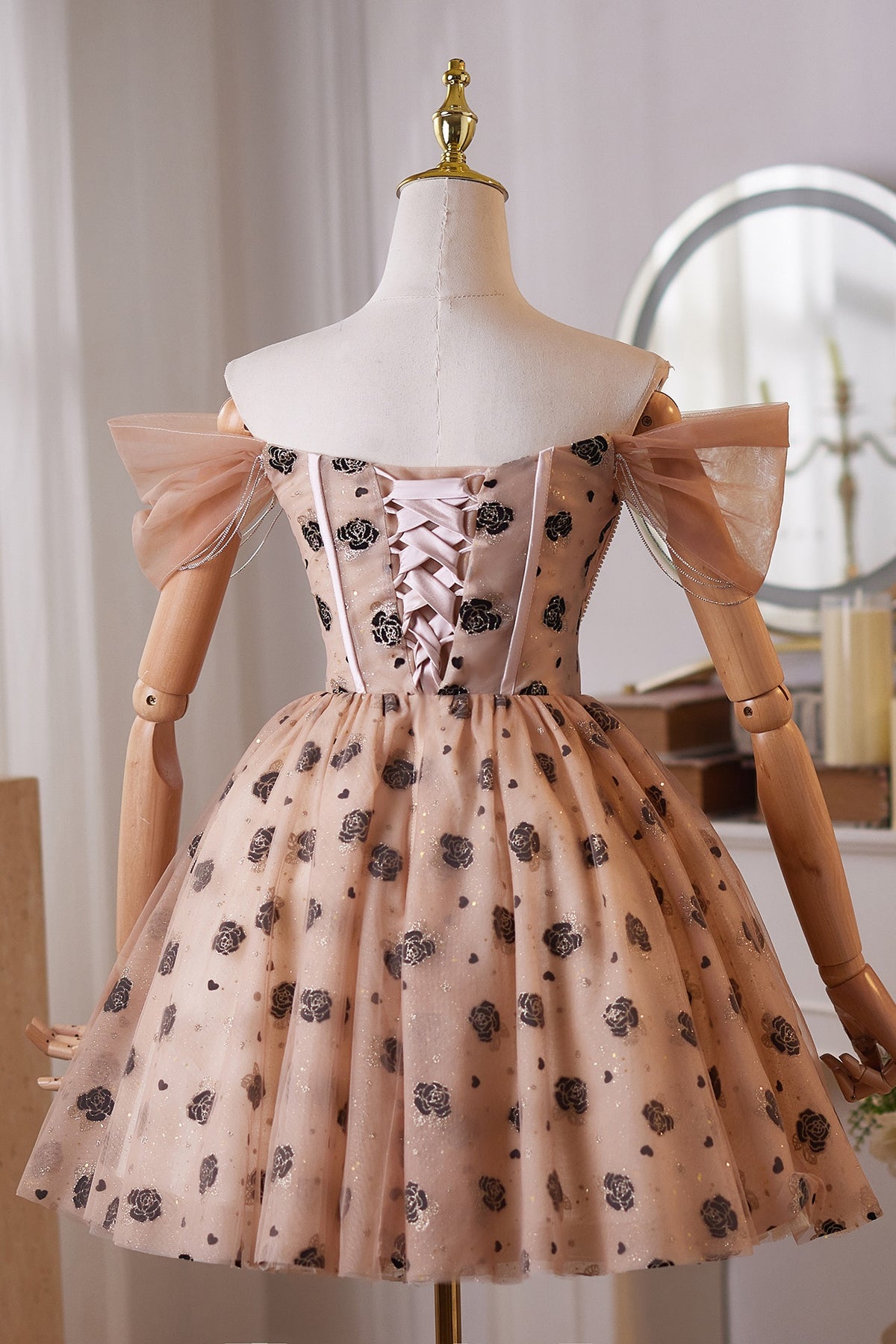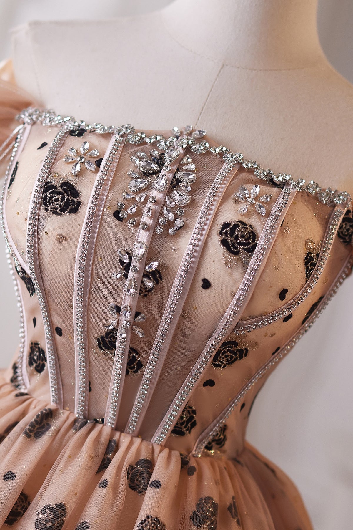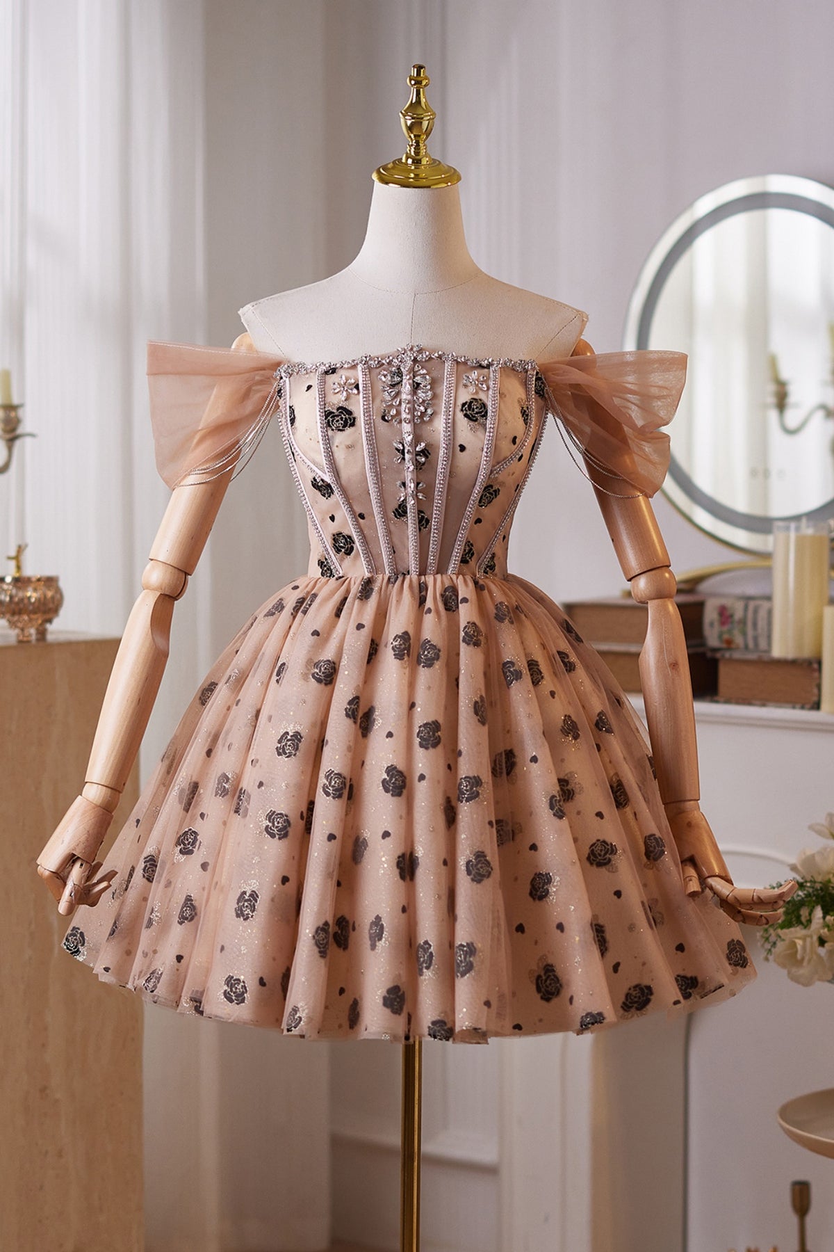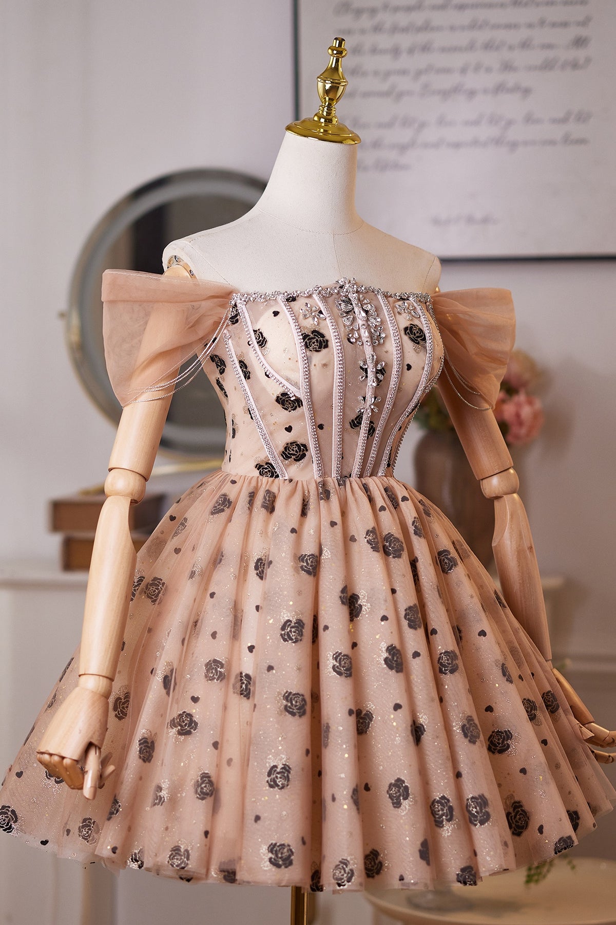 Deep Nude Off-shoulder Rhinestone Puffy Mini Dress