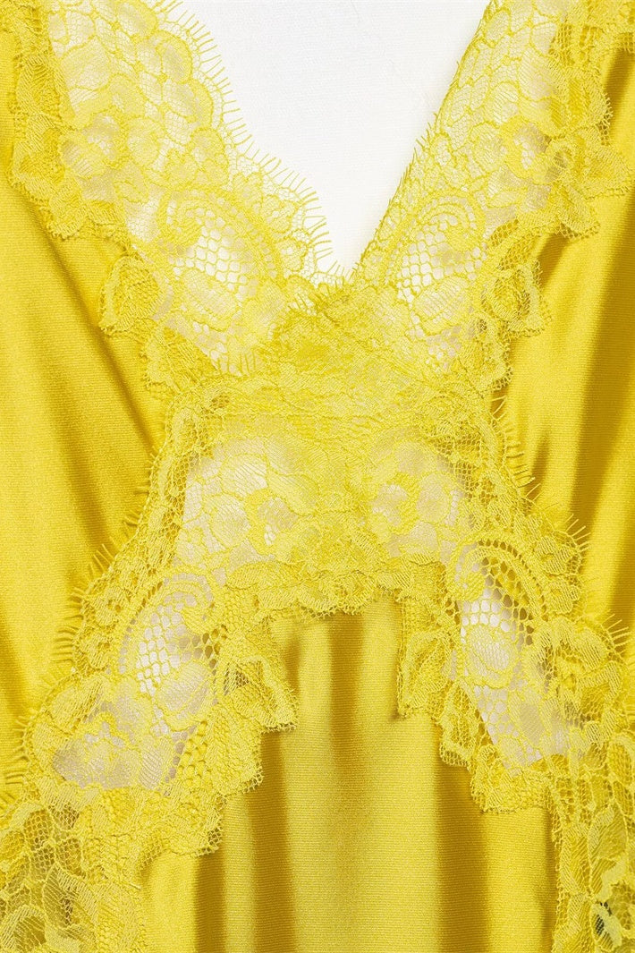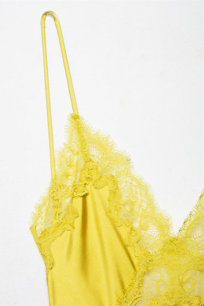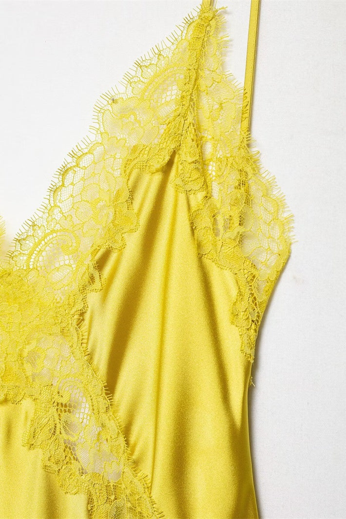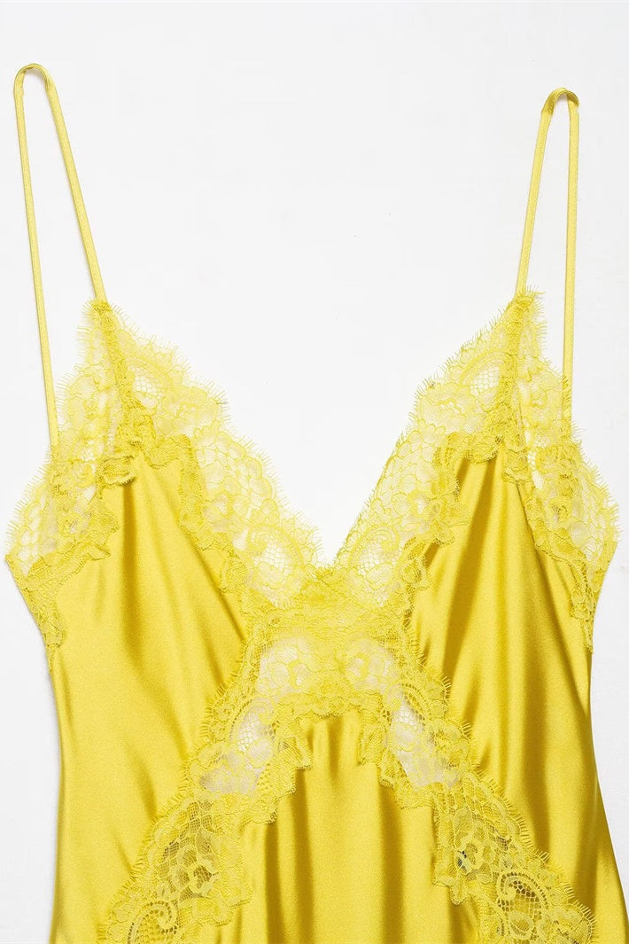 Golden V-neck Lace Trim Long Dress