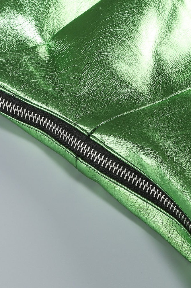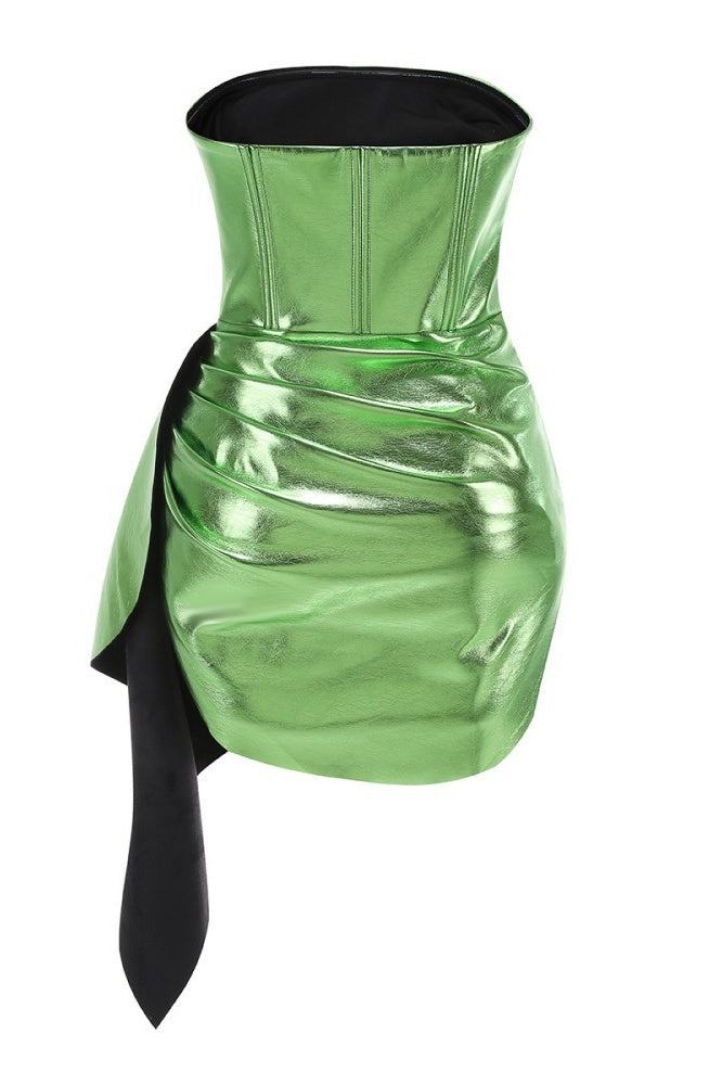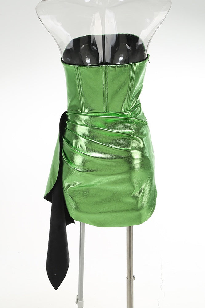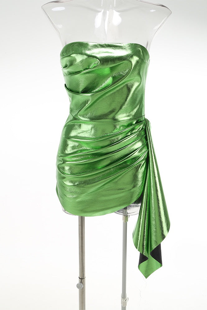 Crafted from PU leather in a green shade, this mini-length bodycon dress features a tube top silhouette with ruched accents. It is designed with a side zipper for a snug fit, offers a subtle sheen, and includes a stylish side train for enhanced elegance.