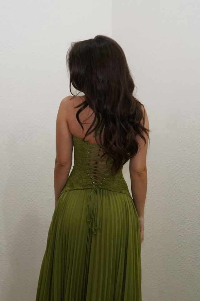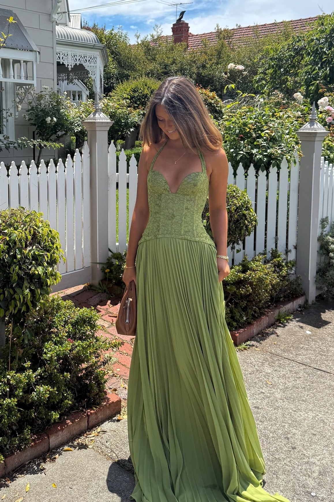 Green Halter Floral Lace Boned Corset Maxi Dress