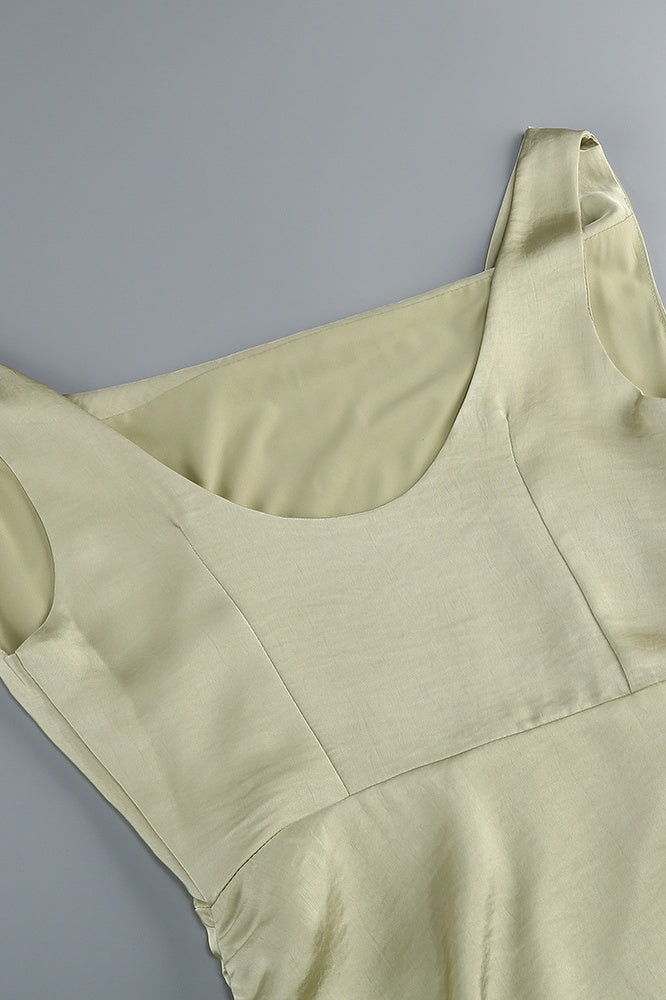 This maxi dress features a satin fabric in a light green shade with a slim silhouette. It showcases a cowl neckline and pleated accents, complemented by wide straps and a daring high side slit. The design includes a low back, enhancing its elegant appeal.