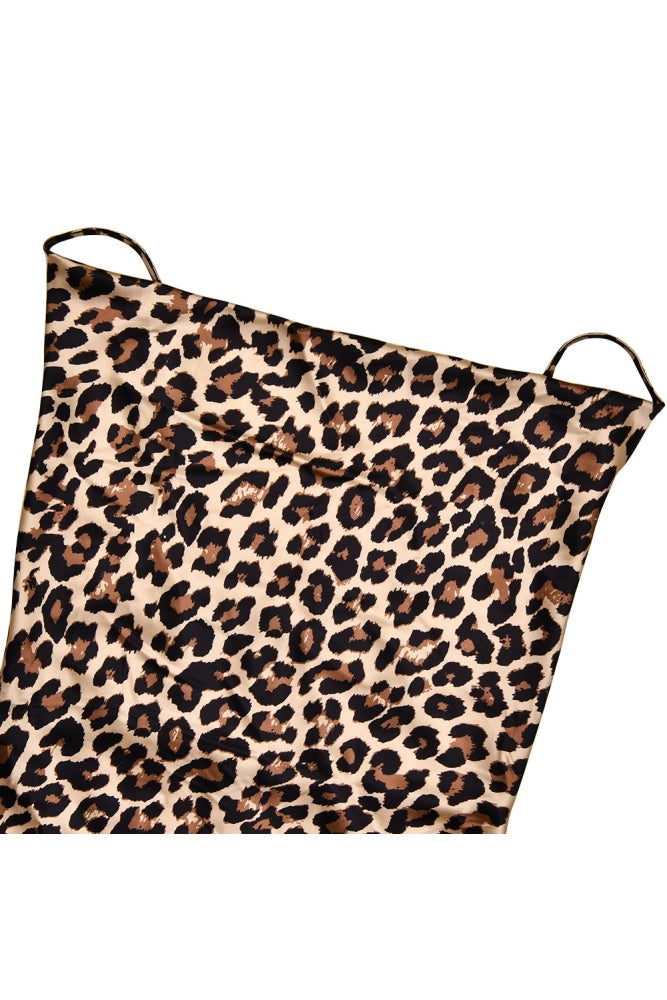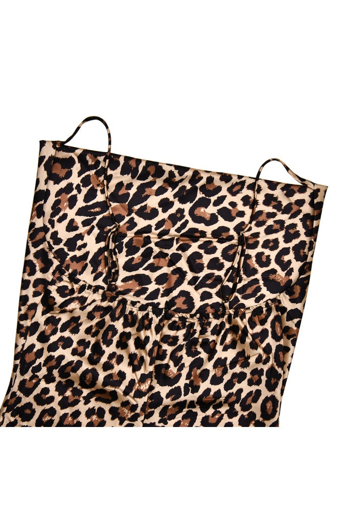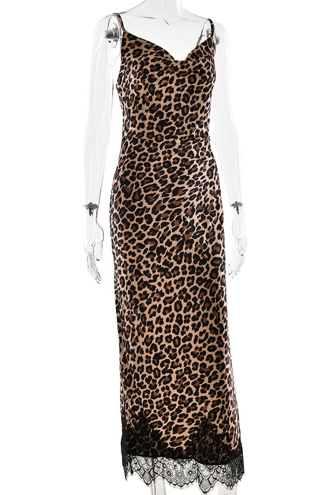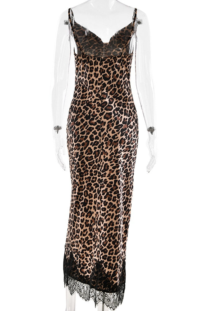 This long satin dress features a leopard print design with an A-line silhouette and a V-neckline. It is styled with delicate spaghetti straps, lace trim detailing, and a low back for an elegant finish.