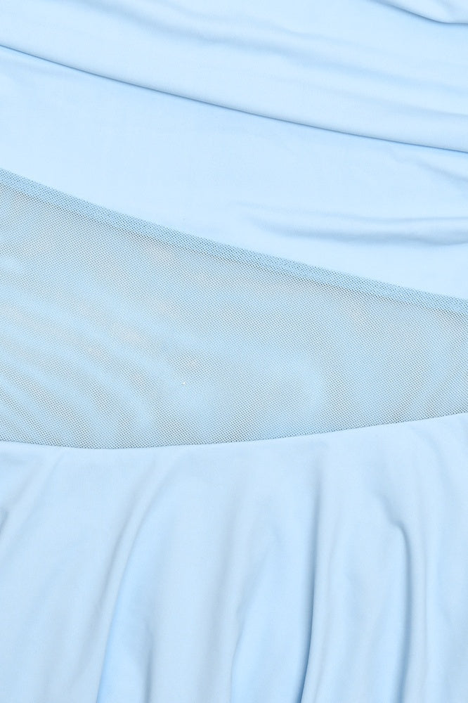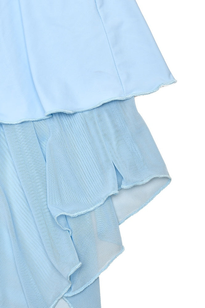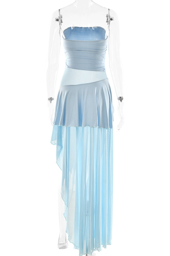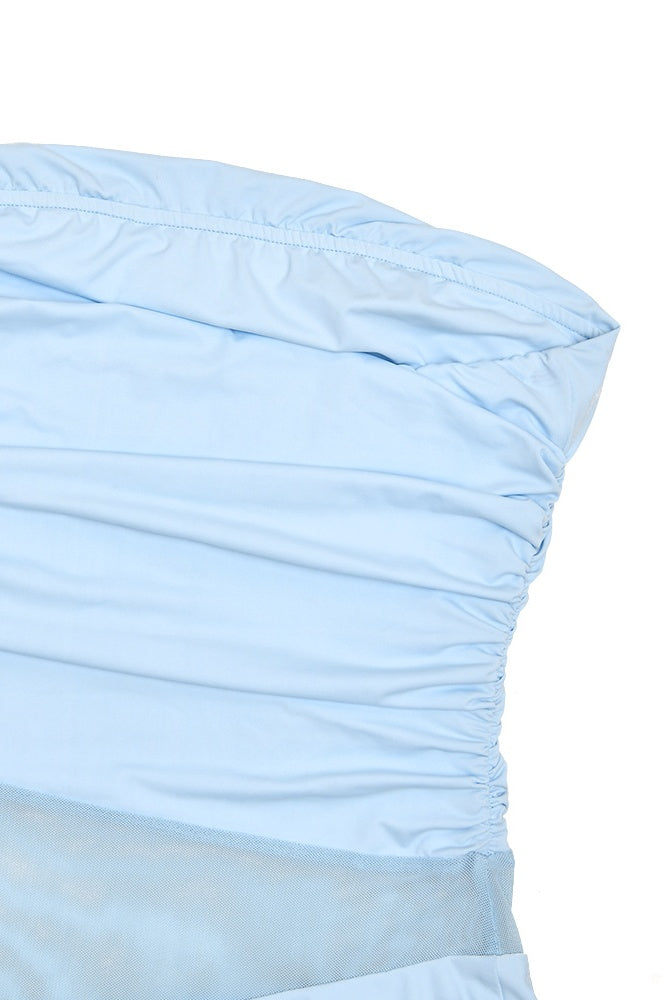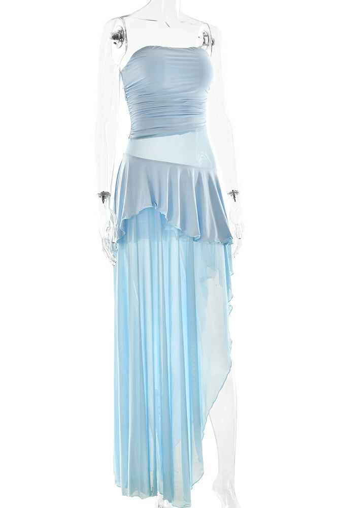 This light blue, strapless bodycon dress features a tulle panel and an asymmetrical hemline for a distinctive silhouette. Crafted from polyester, it offers a long length and a low back design, combining elegance with a modern edge.
