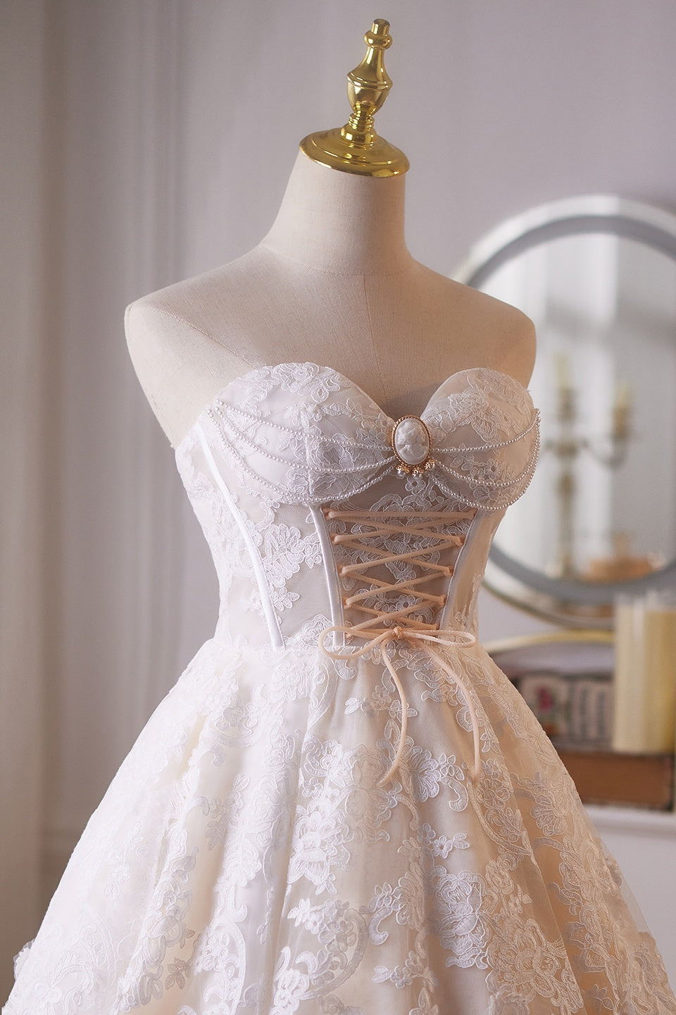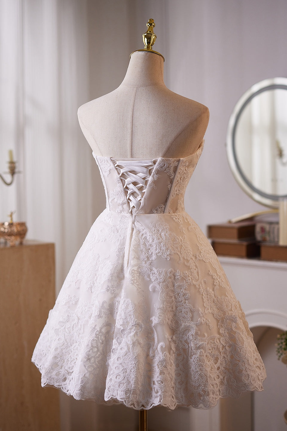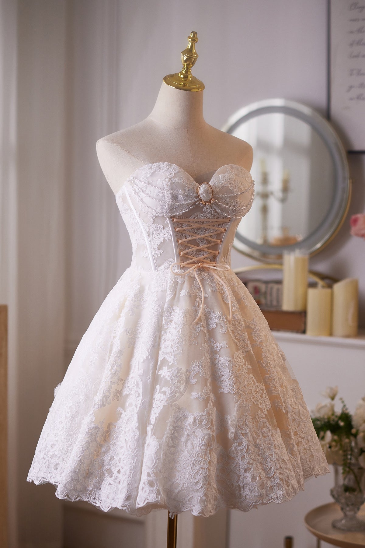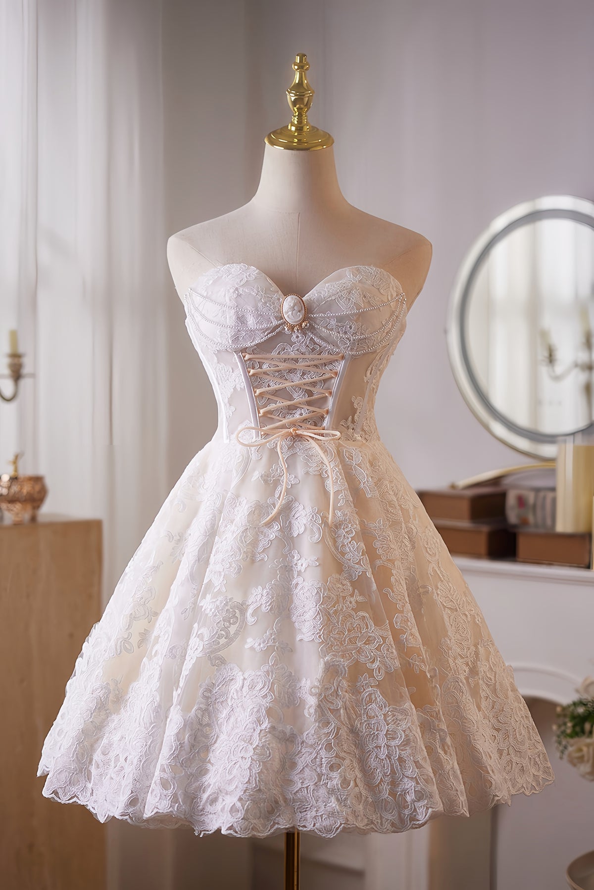 This enchanting mini dress features a sweetheart neckline adorned with pearl and tie embellishments that elevate its romantic appeal. Crafted from delicate embroidered printed tulle, the A-line silhouette flatters the figure while the layered construction adds dimension and movement. The low back design creates an alluring detail, secured with a convenient back zipper for easy wear. Perfect for evening events and special occasions, this light pink dress combines sophisticated construction with graceful femininity.
