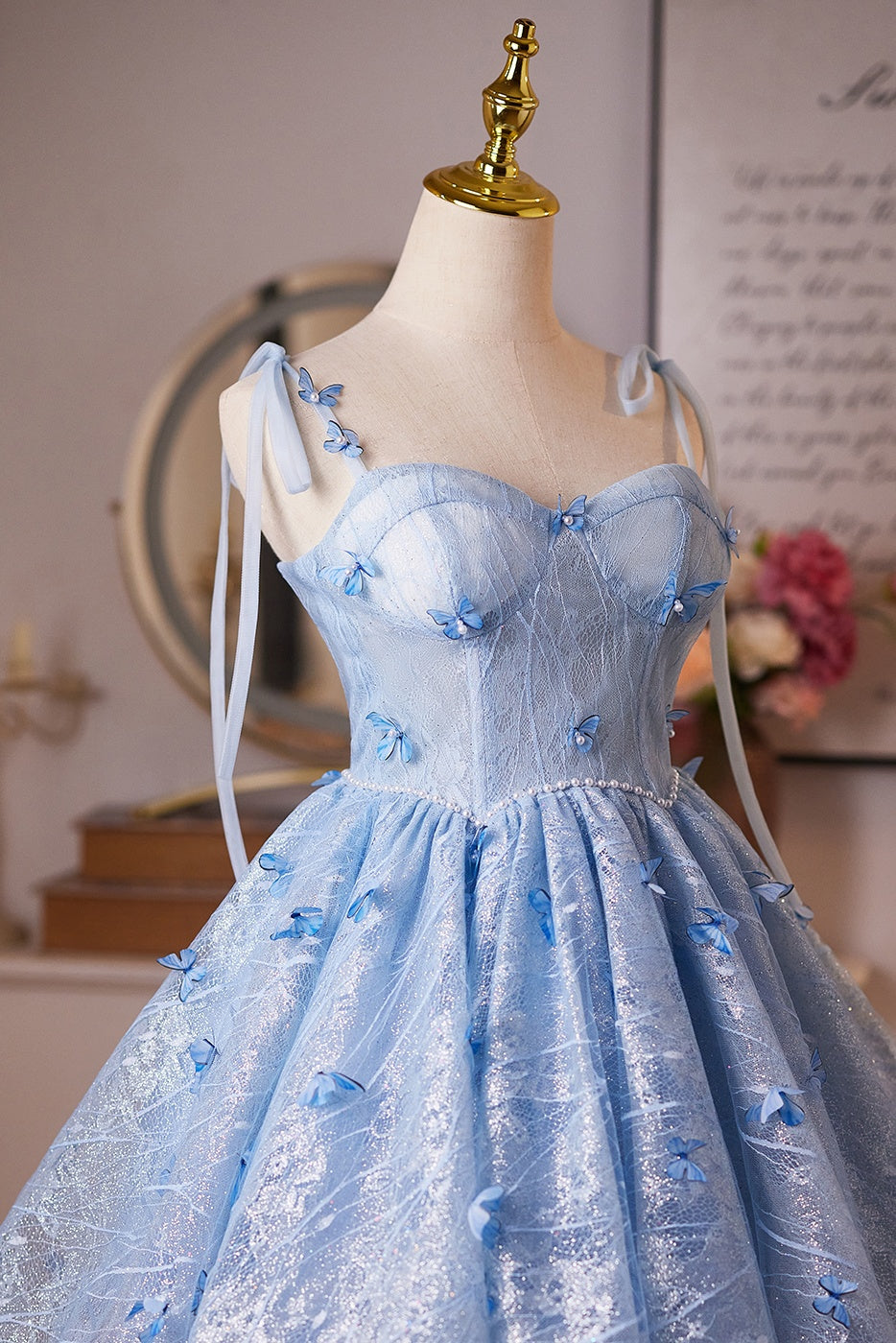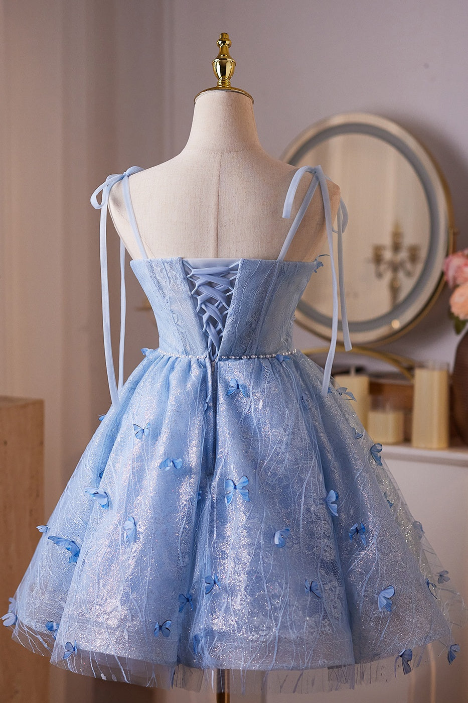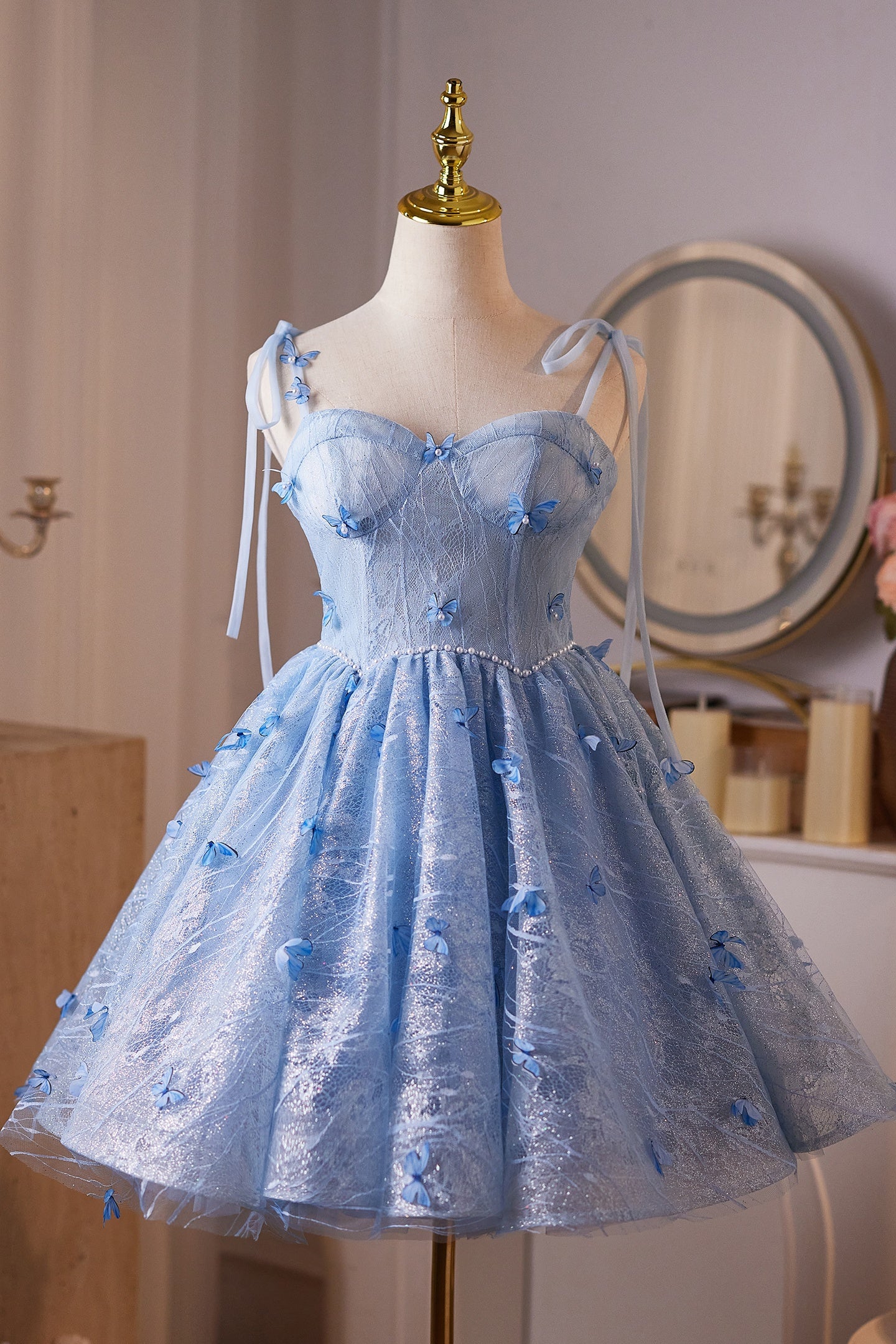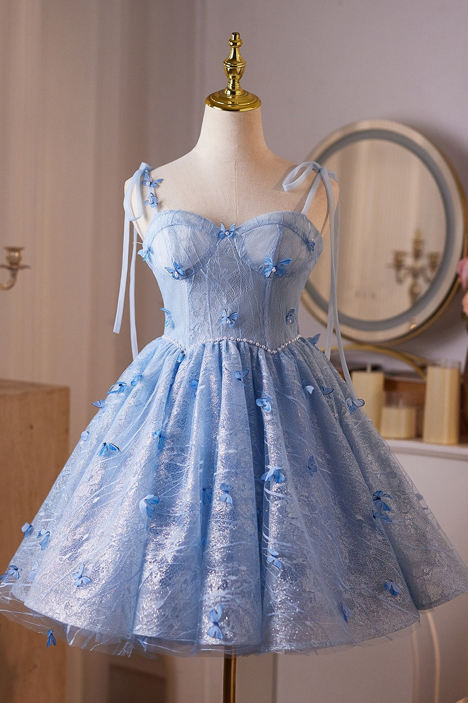 Sky Blue A-line Pearl and 3D Butterfly Puffy Mini Dress