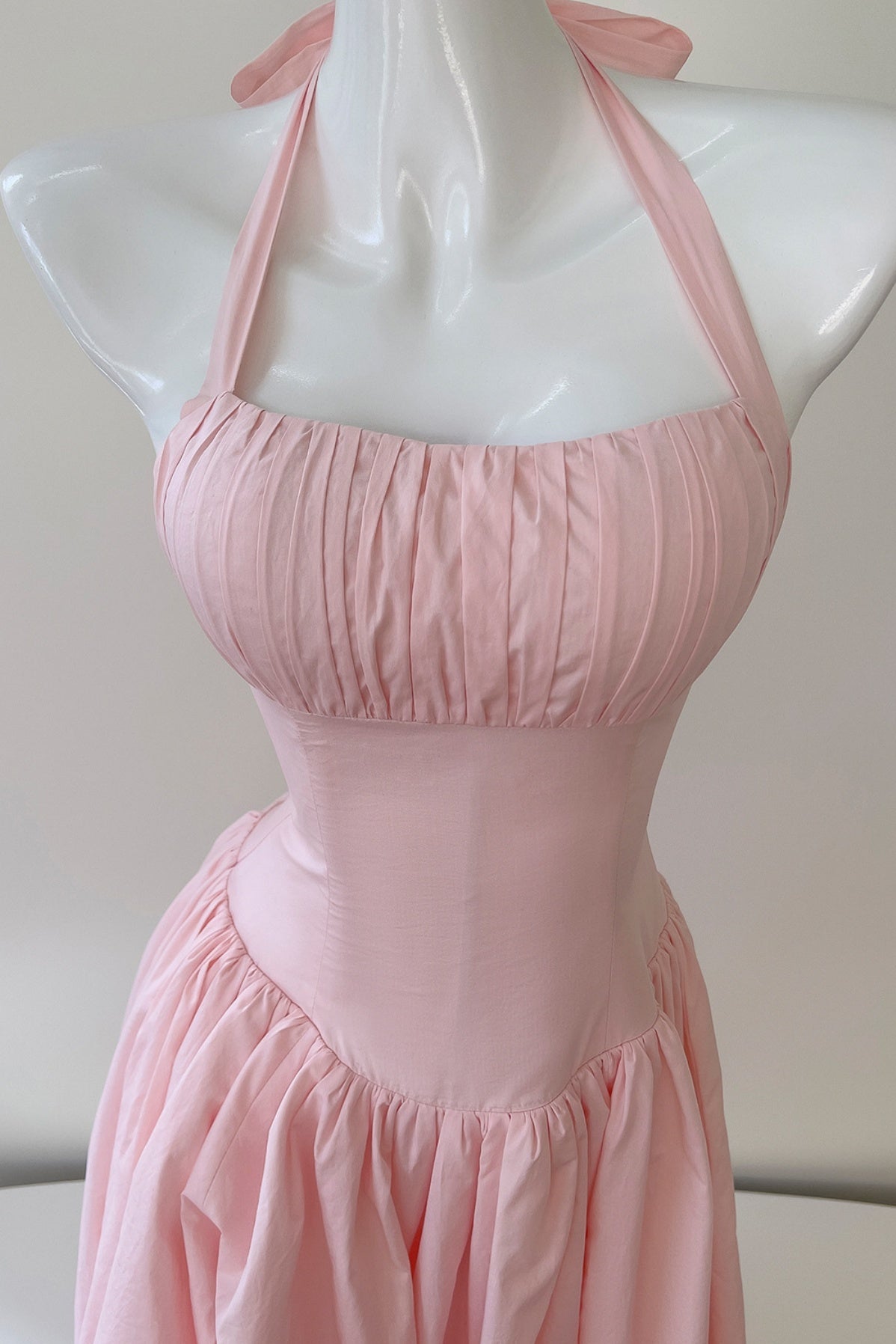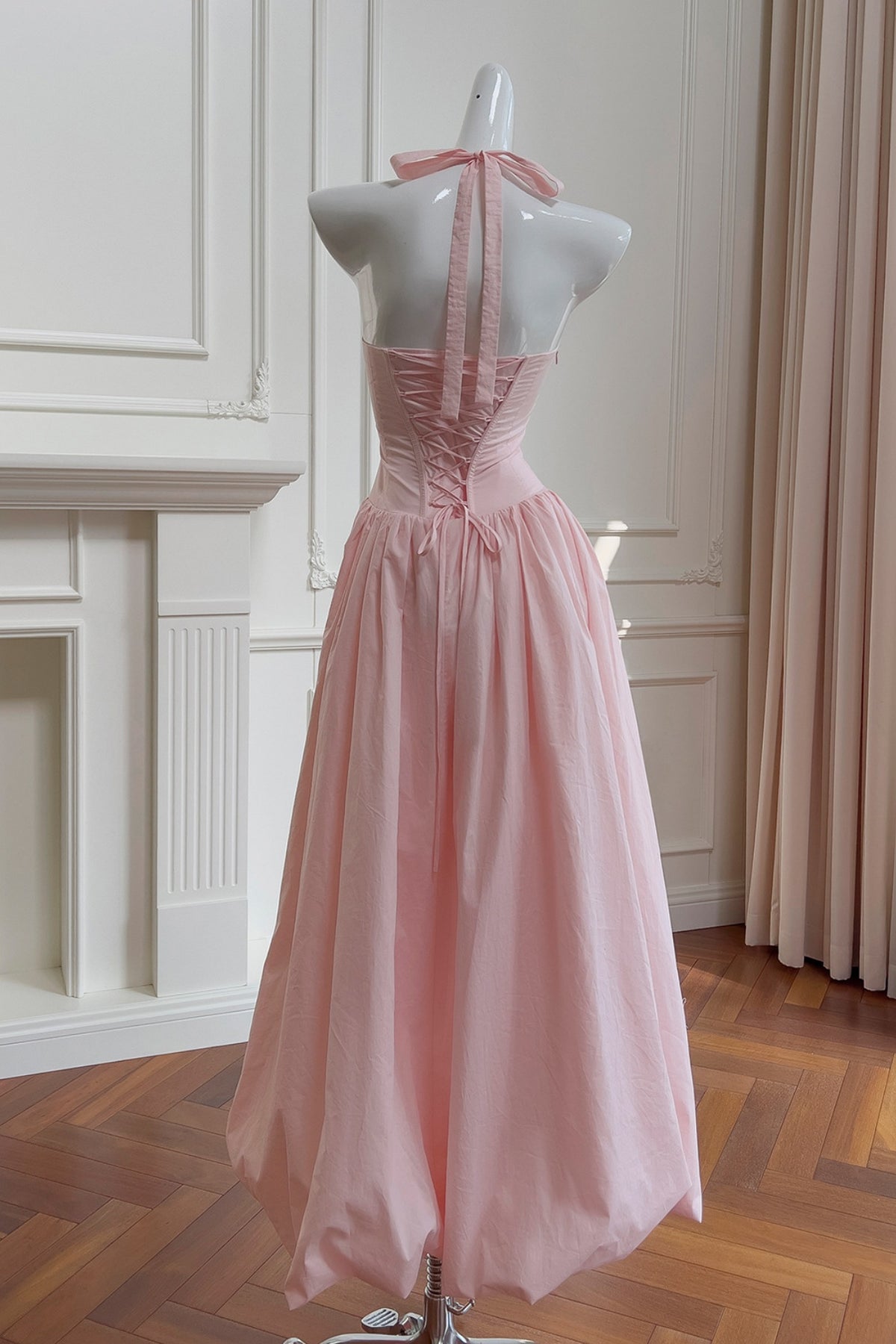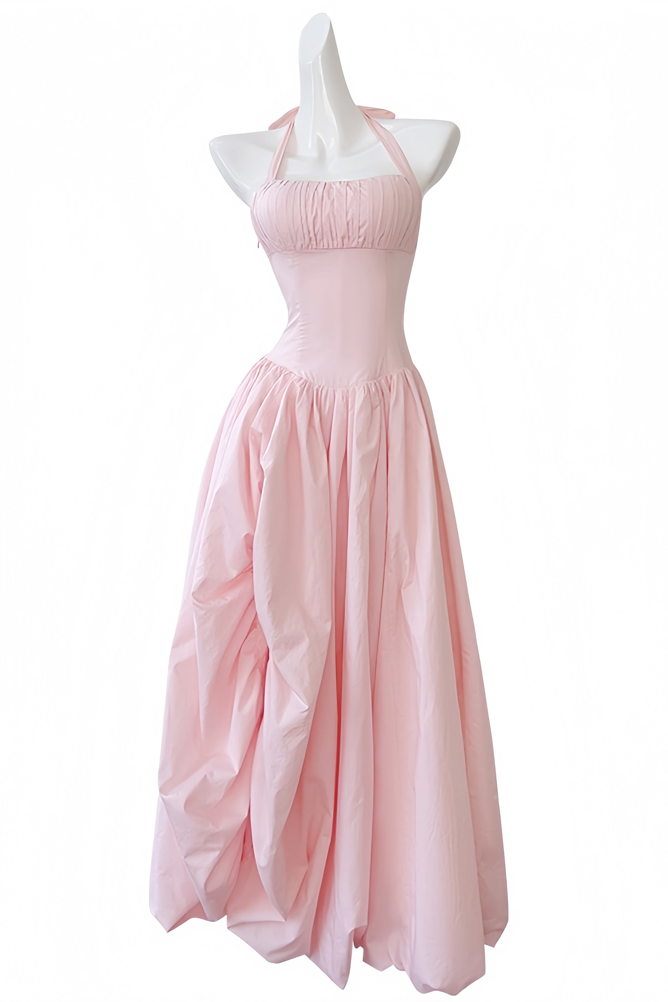 Crafted from spandex, this light pink A-line dress features a halter tie neckline and pleated detailing. It showcases a distinctive bubble hem with a side slit and a discreet side zipper for ease of wear. The long dress offers a low back and a tie-back closure, blending elegance with a modern silhouette.