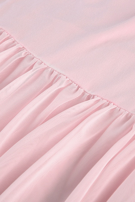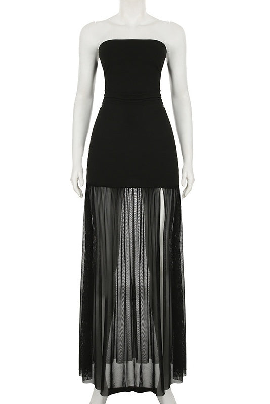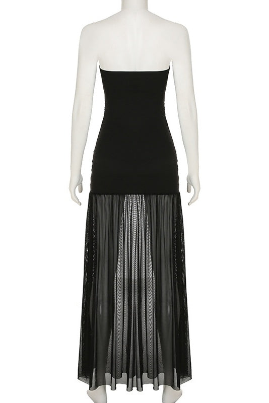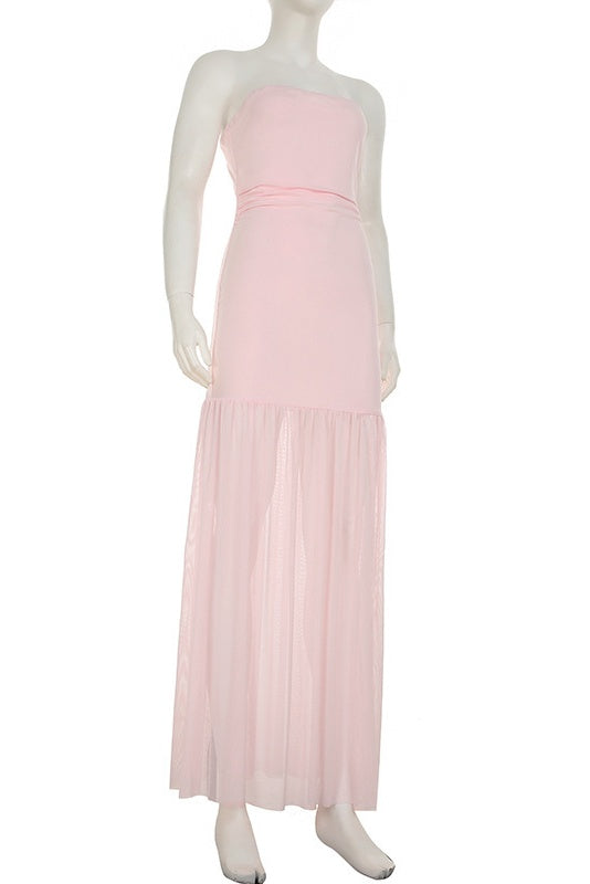 This pink maxi dress, crafted from polyester fiber, features a tube top design with tiered ruffles and pleated detailing. The flowy hem enhances its elegant and dynamic silhouette.