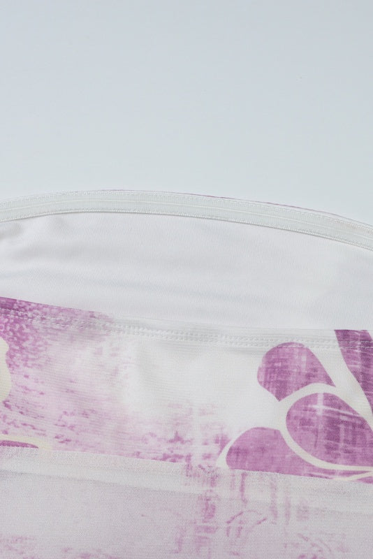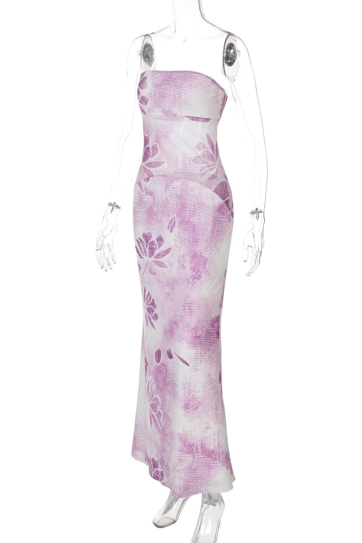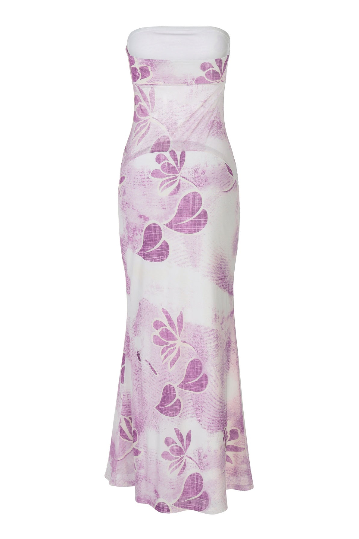 This strapless mermaid dress in light purple print is made from polyester fiber, featuring a flowy hem and a low back. Its long silhouette combines elegance with a flattering fit.