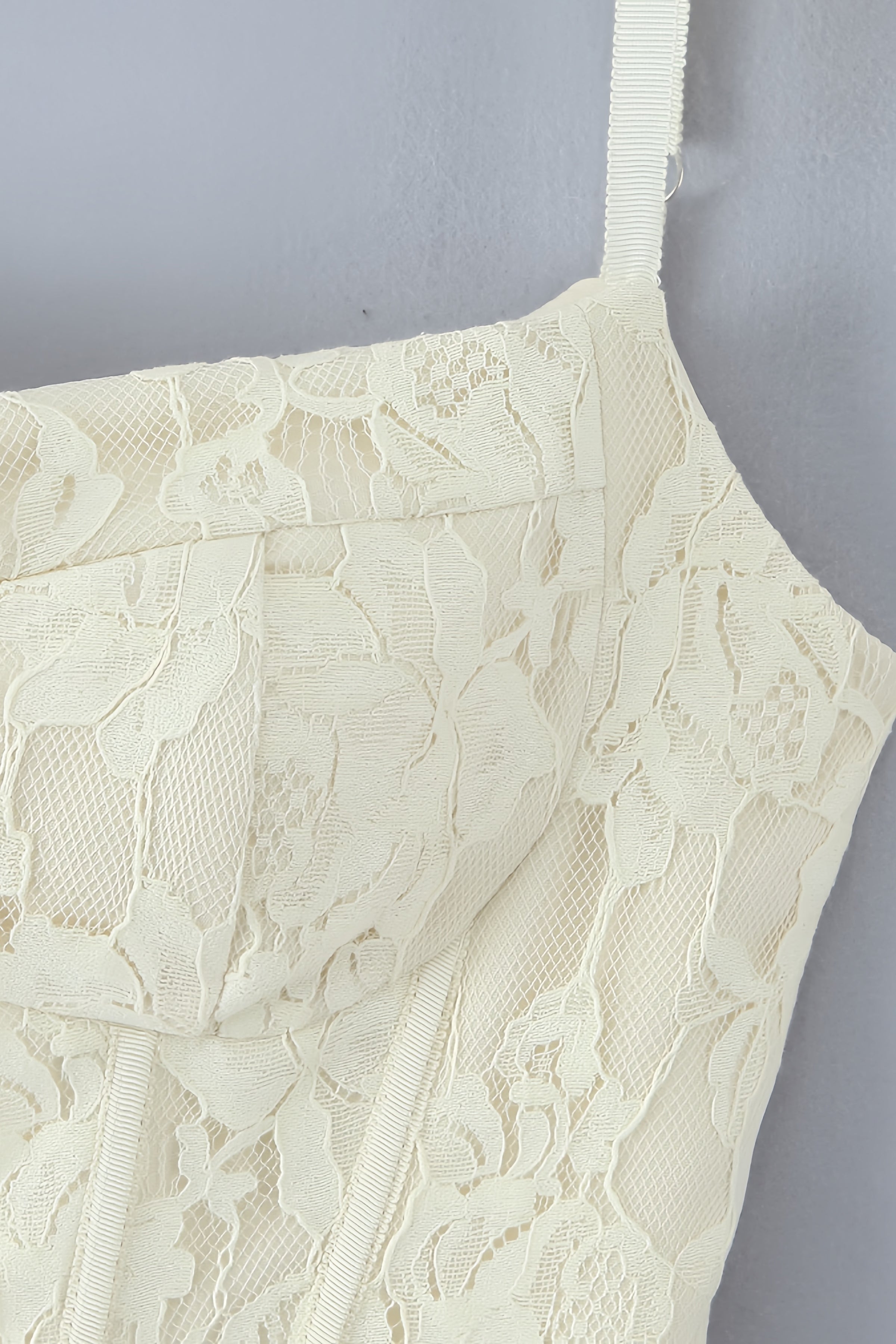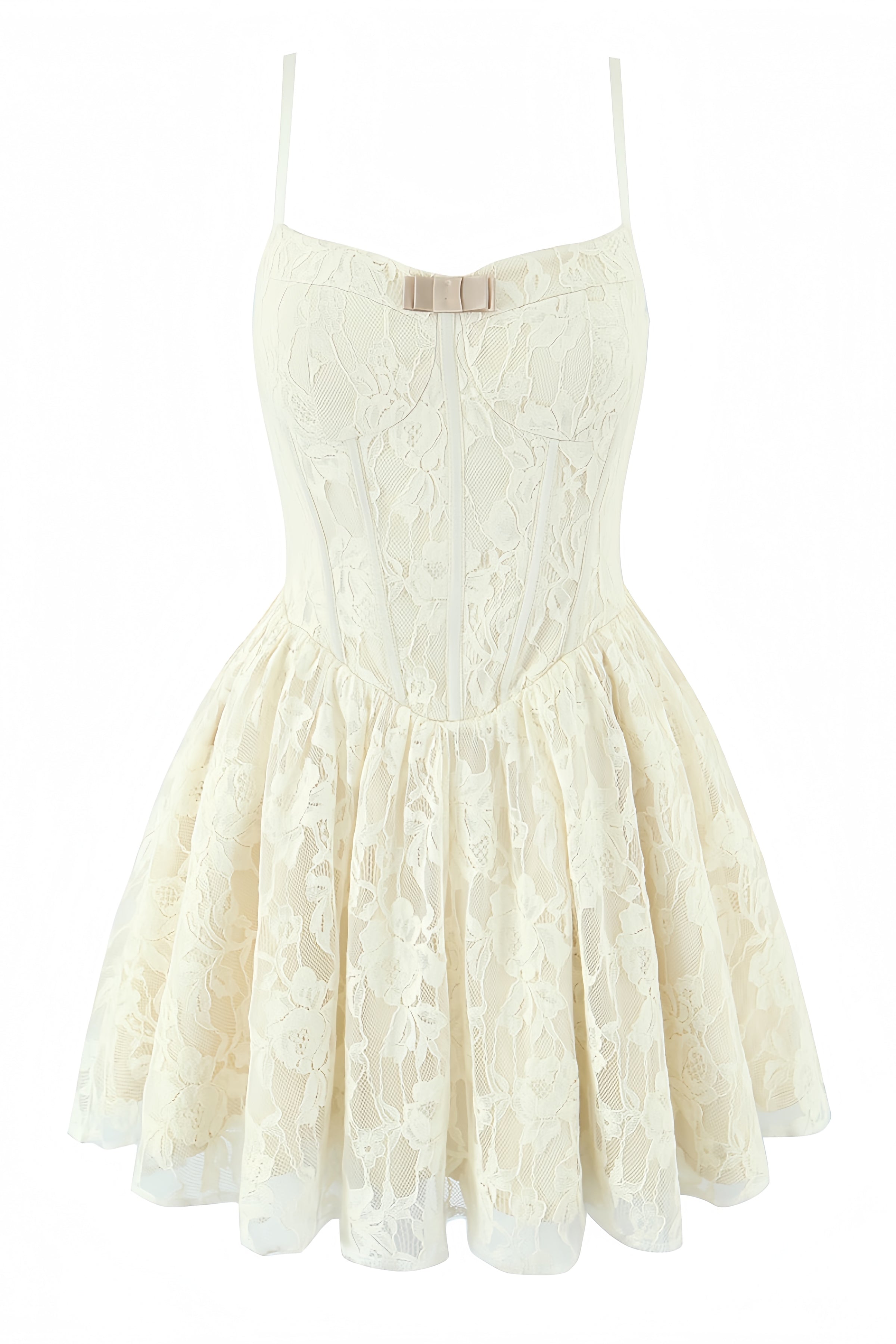 Constructed from polyester, this light yellow dress features an A-line silhouette with delicate spaghetti straps. It is adorned with lace detailing and a distinctive bust bow. The dress includes a ruffled hem, a back zipper for easy wear, a mini length cut, and a low back design for added elegance.
