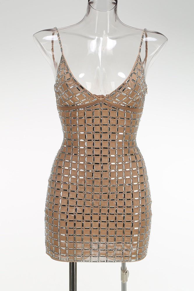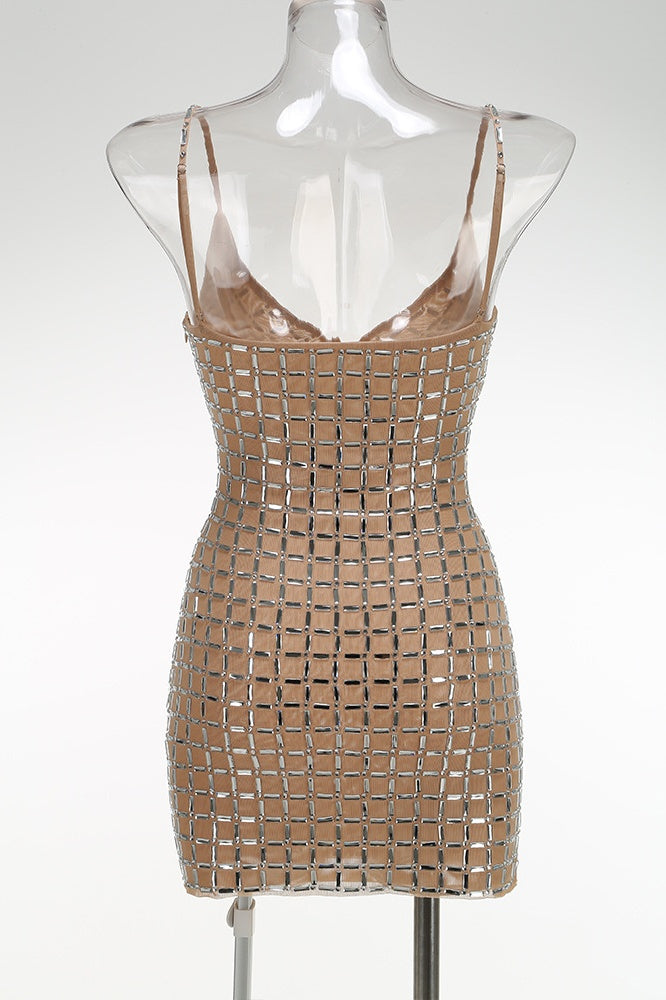 This bodycon mini dress features a nude spandex fabric with a V-neckline and delicate spaghetti straps. Adorned with rhinestones, it highlights a low back and a waist-cinched silhouette for a flattering fit.