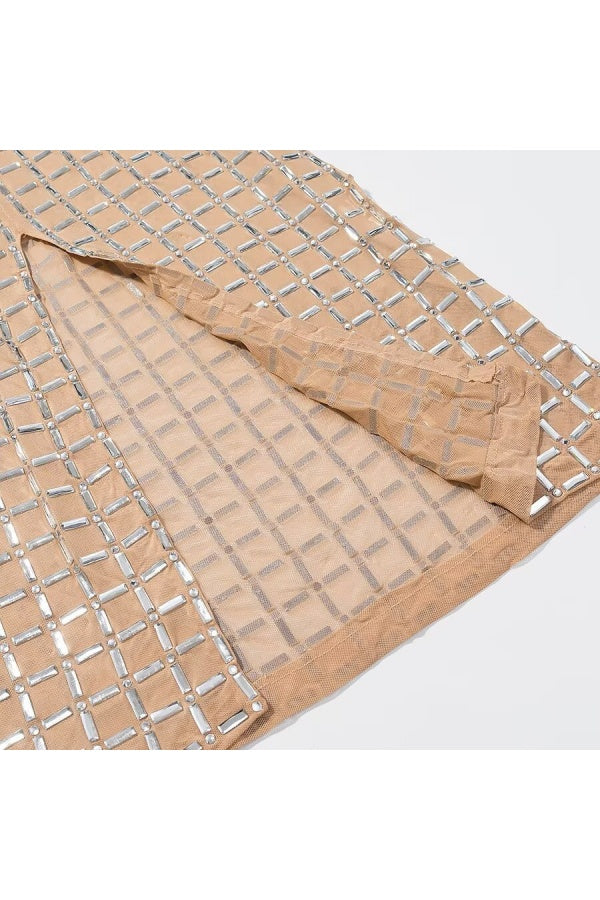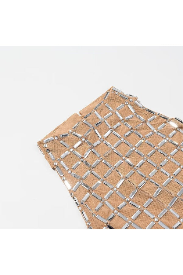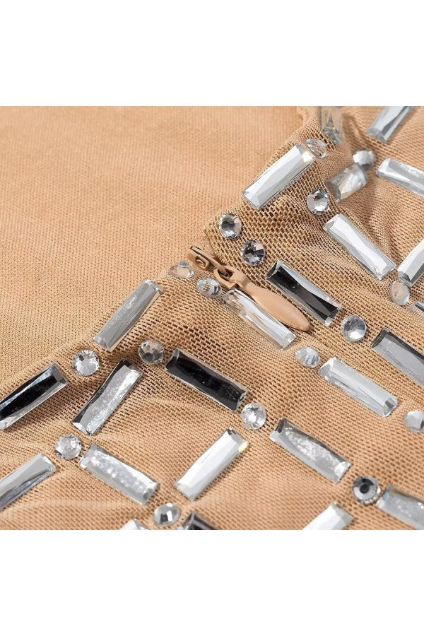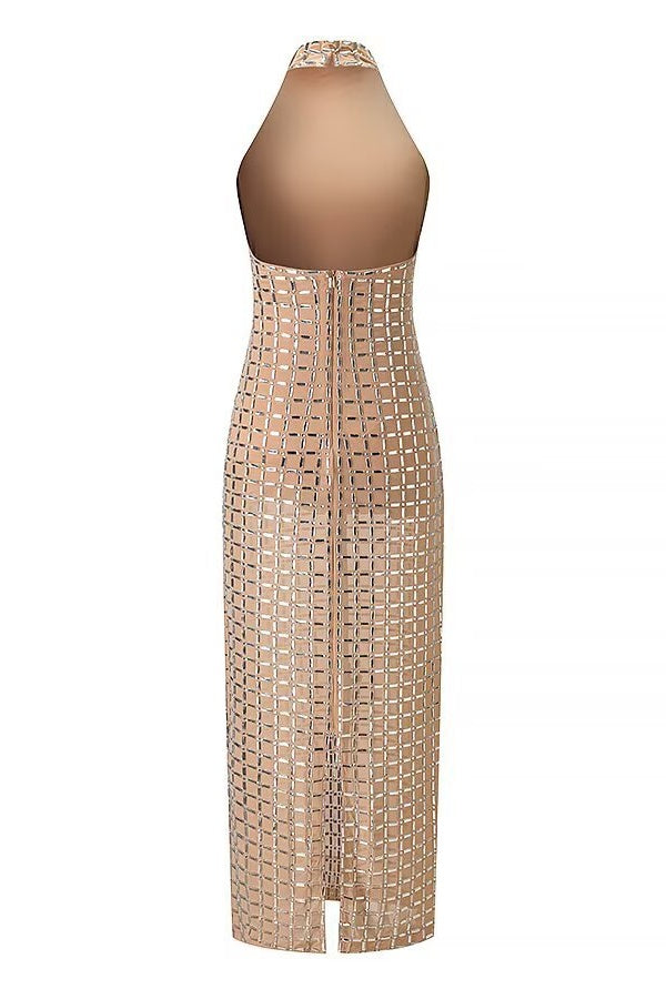 Stunning nude bodycon mini dress featuring a halter neckline, rhinestone embellishments, and low back design. Button closure at back with convenient zipper and slit for easy movement. Perfect for evening events and parties.