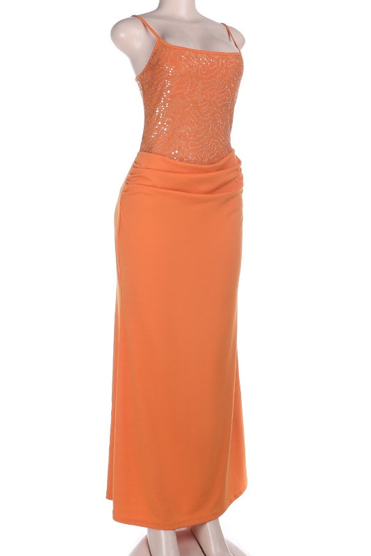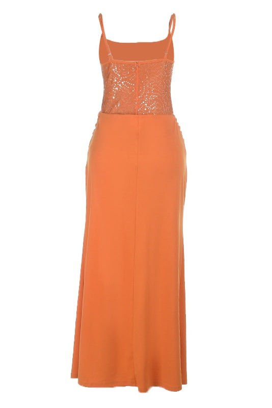 This floor-length dress features a fitted silhouette with elegant spaghetti straps and shimmering sequin panels throughout. The draped cowl waist adds sophisticated movement, while the back zipper ensures easy wear. Crafted from polyester in a vibrant orange hue, it's designed for standout moments.
