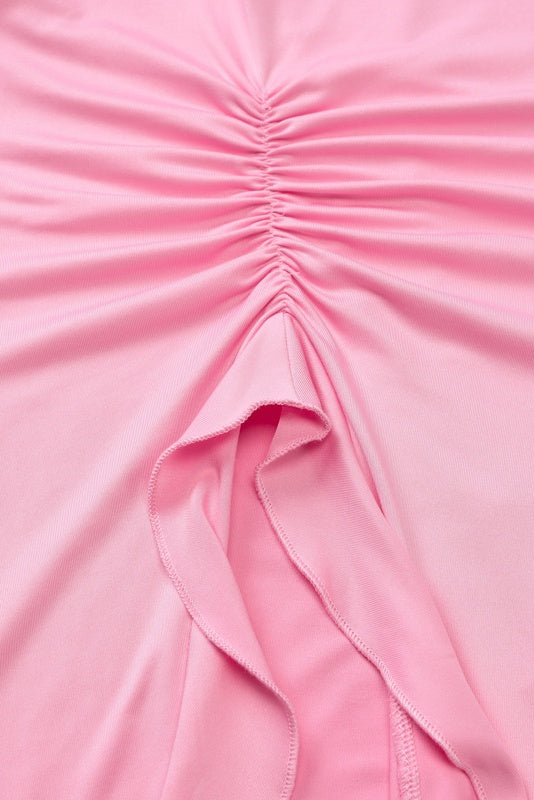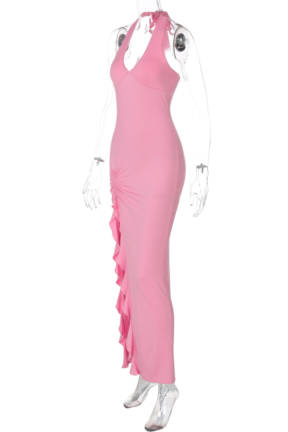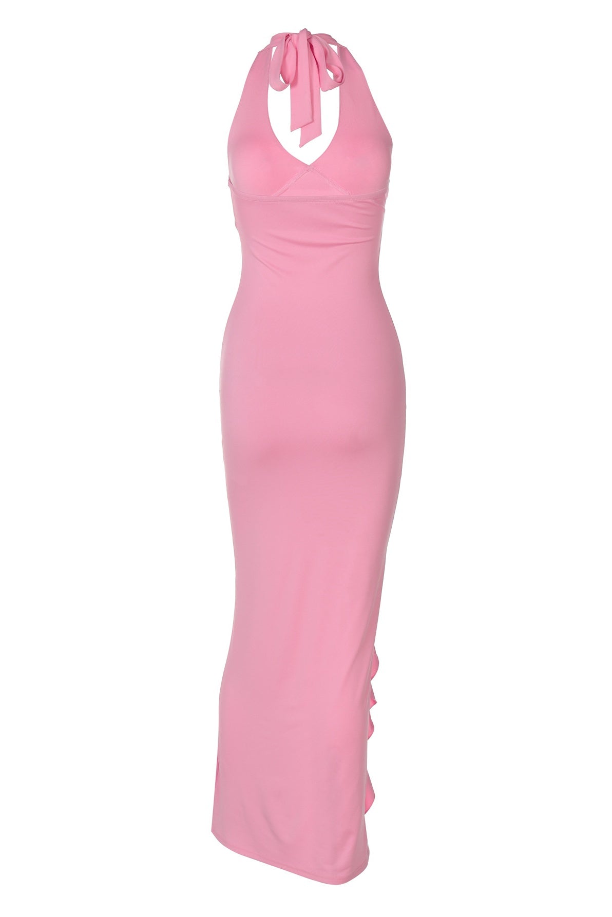 Crafted from satin, this light pink bodycon dress features a V-neck and a distinctive asymmetrical ruffled hem. Its halter tie design and side slit add elegance, complemented by a low back silhouette, making it a striking long dress choice.