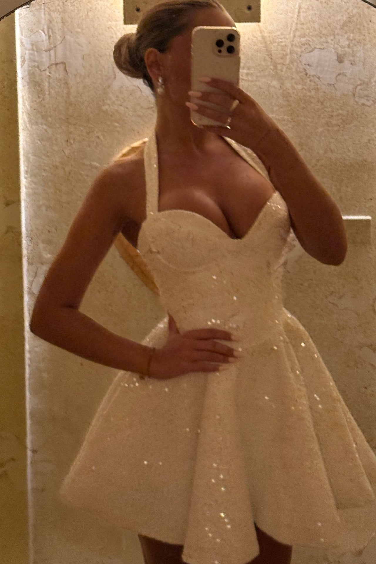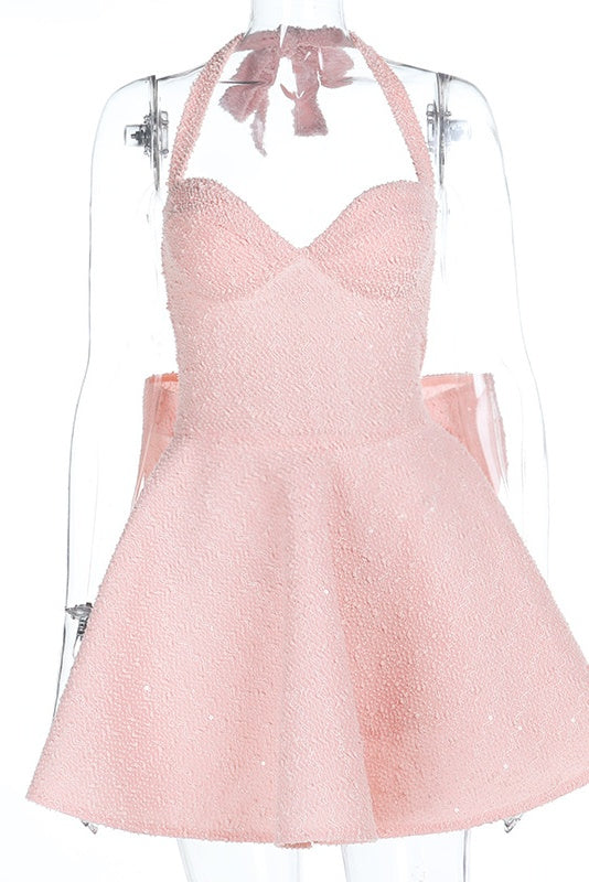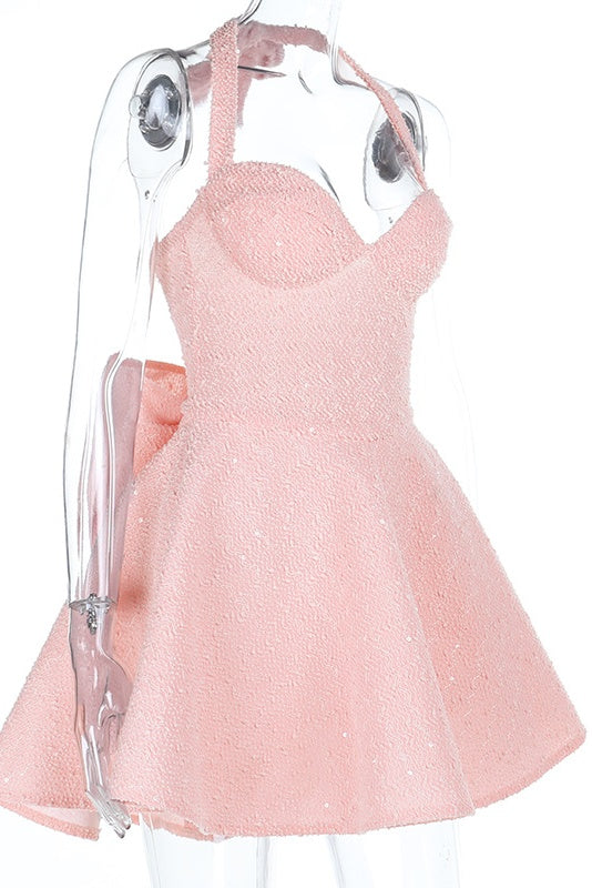 Light pink mini dress with halter neckline, A-line cut, decorative bow, and pearl accents for a polished party look.
