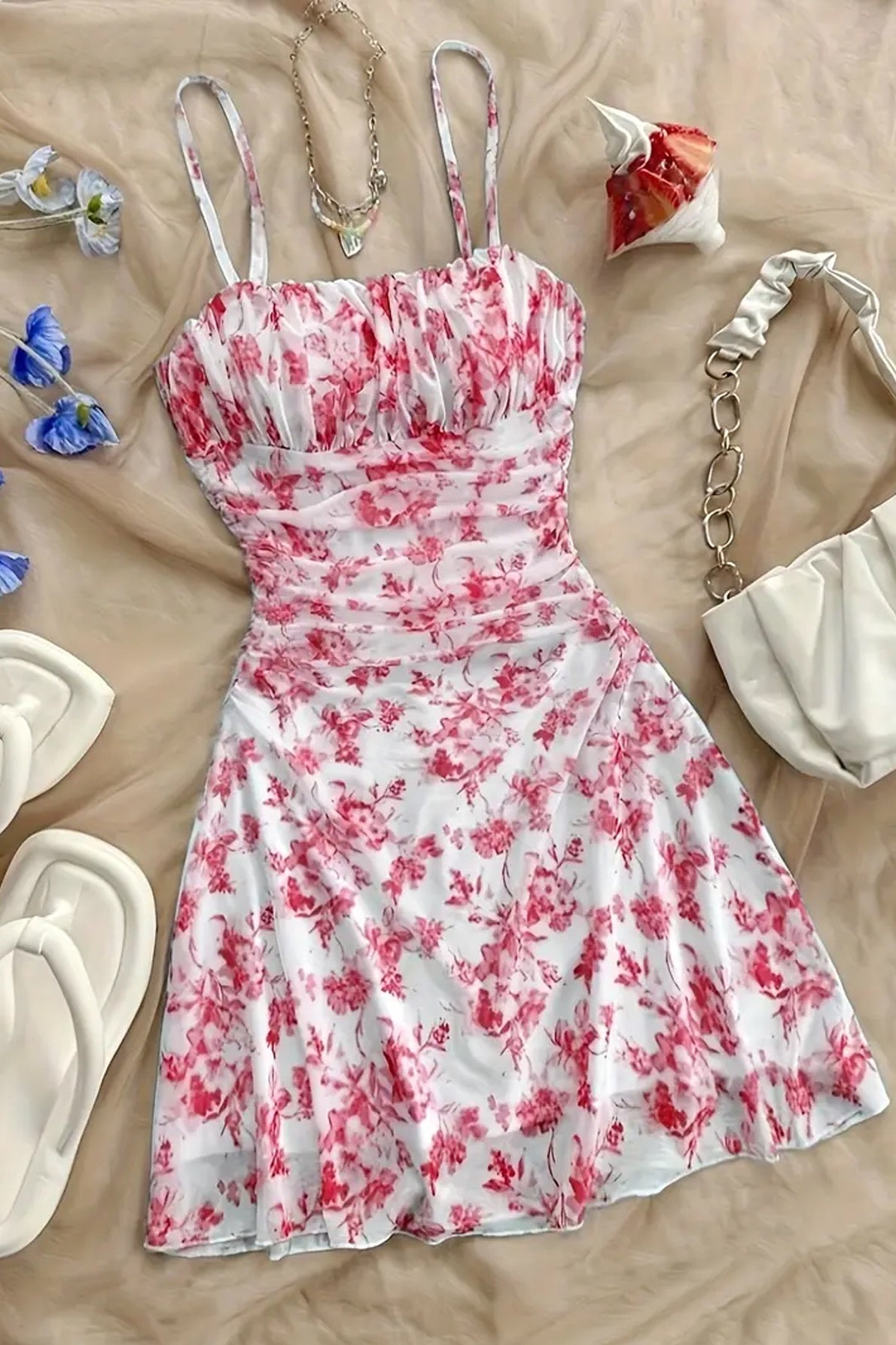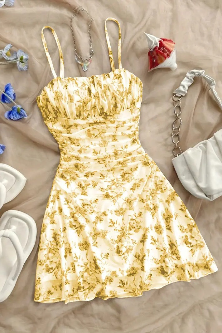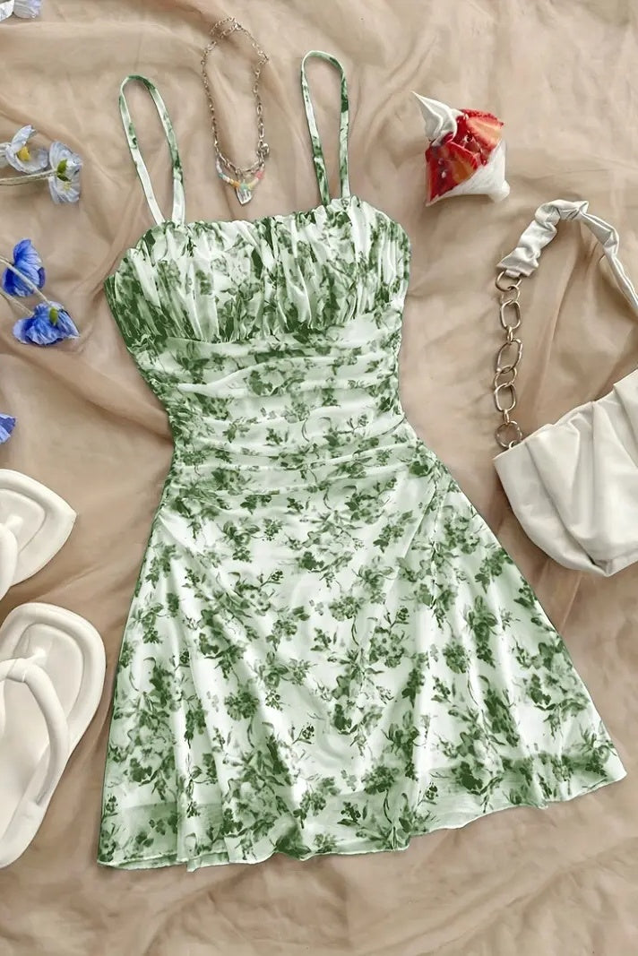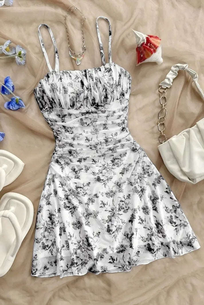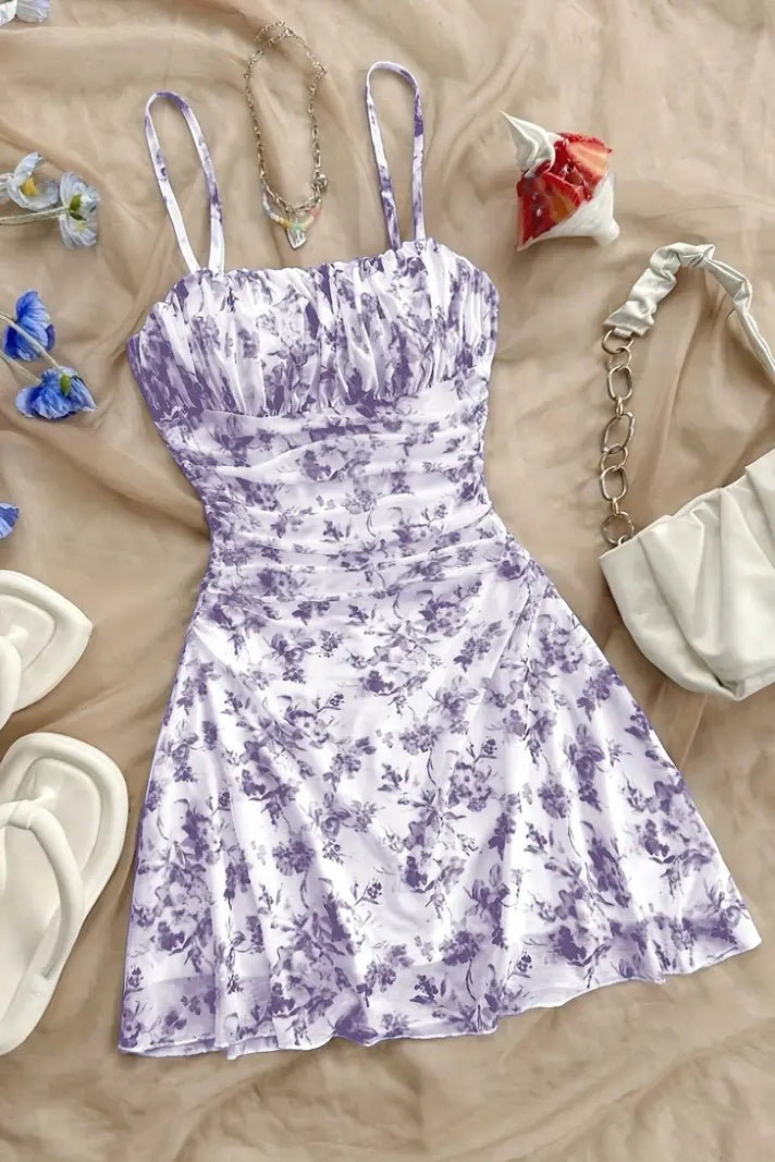 This light blue mini dress features a polyester build with a fitted waist and an A-line silhouette. It includes delicate spaghetti straps, a flowing hem, and is adorned with a floral print for an elegant, flattering look.