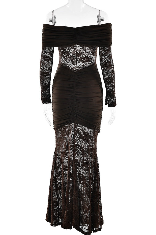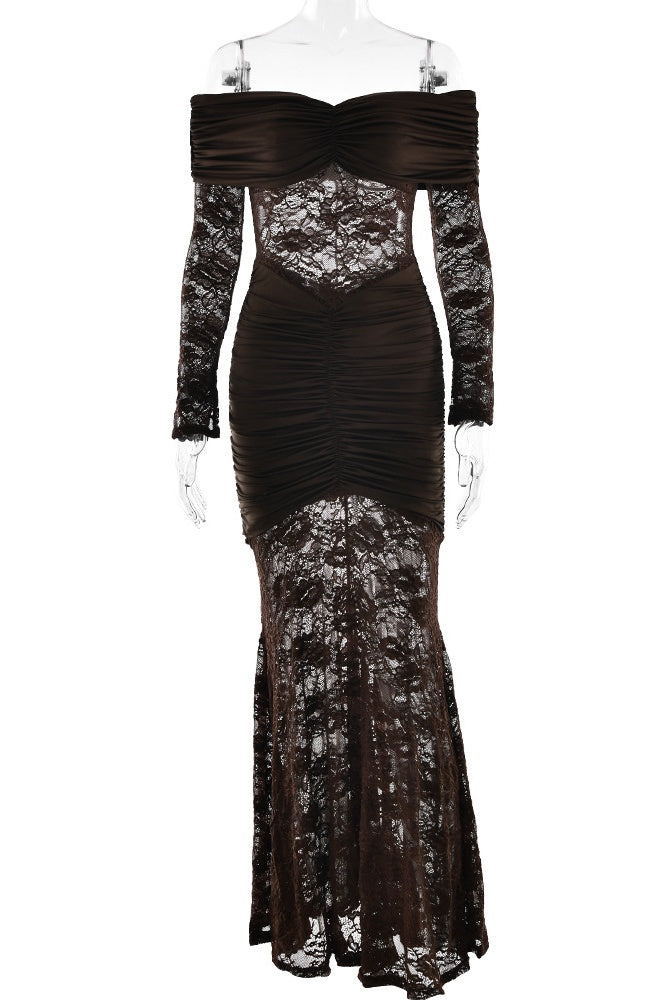 Printed Mesh Patchwork Fitted Off-the-shoulder Dress