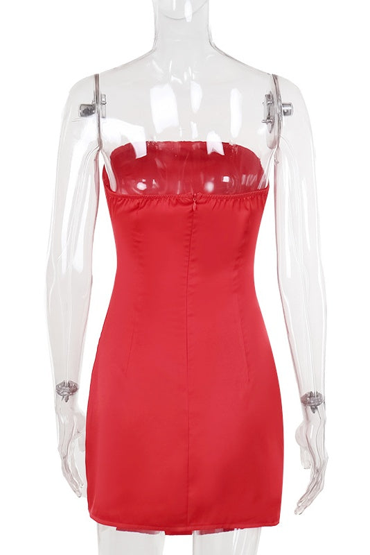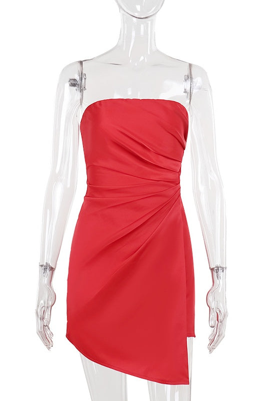 This red strapless mini dress is made from polyester fiber and features a bodycon silhouette with a ruched waist and an asymmetric hem. It has a satin finish, a low back, and is fastened with a back zipper for a refined and polished appearance.