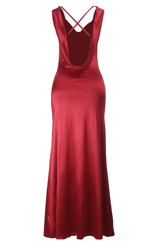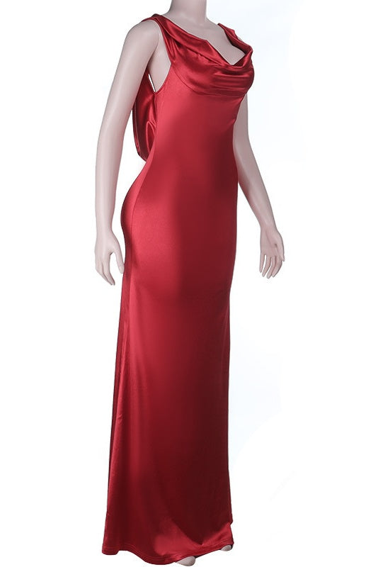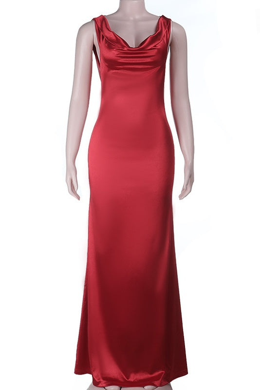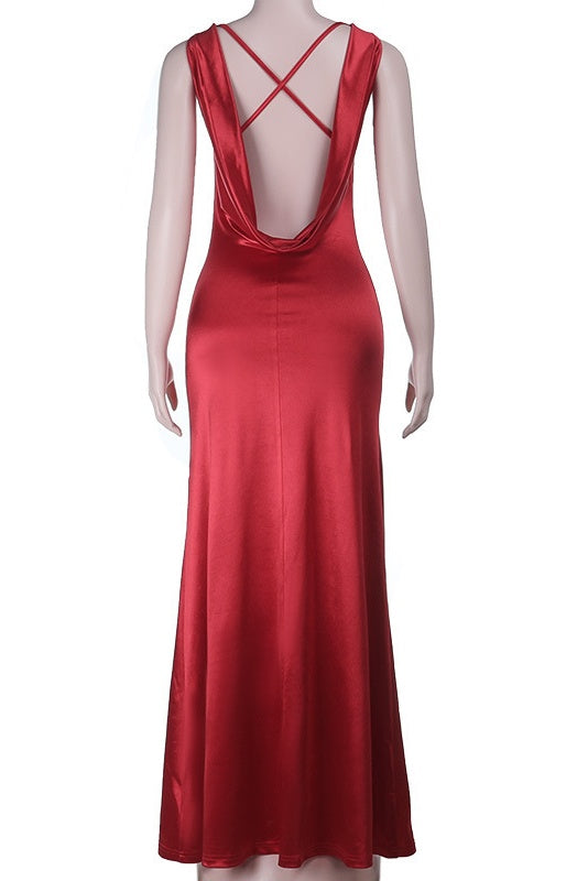 Crafted from satin, this red maxi dress features a bodycon fit with a cowl neckline and a backless design. The flowy hem is accentuated by frilled straps and a back tie, while the fabric’s subtle sheen adds a touch of elegance.