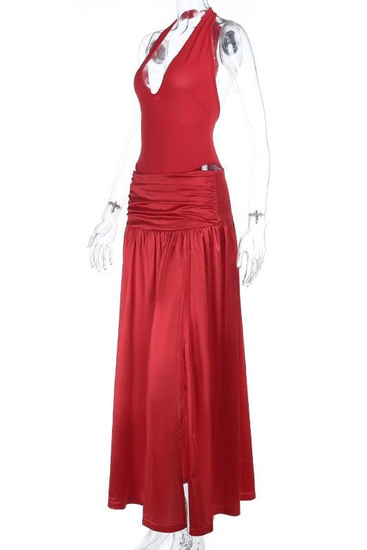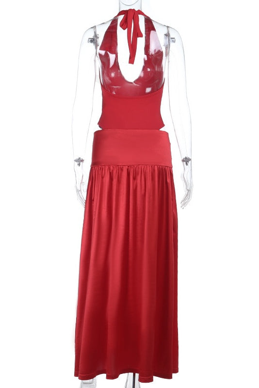 Pink A-line dress featuring a V-neckline with ruffled straps, satin paneling, and a back zipper. Polyester construction in a flattering long silhouette.