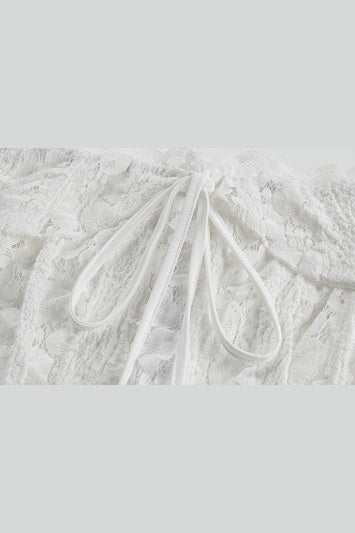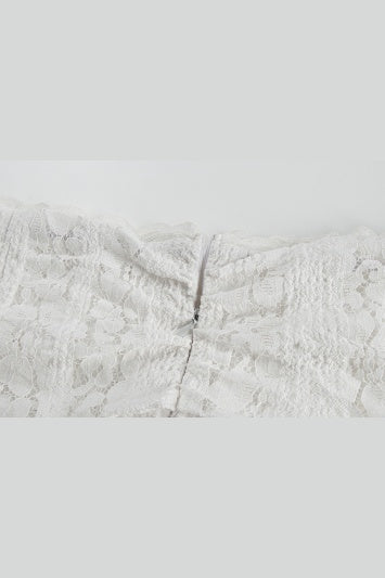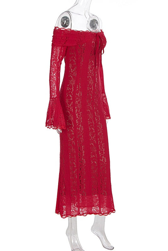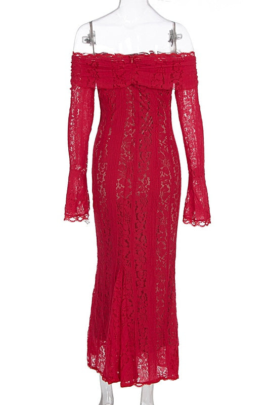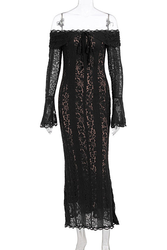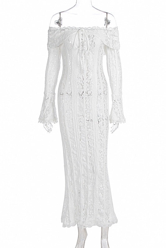 Off-shoulder dress featuring delicate lace print embroidery and fitted silhouette. Long sleeves with bell cuffs and convenient back zipper closure.