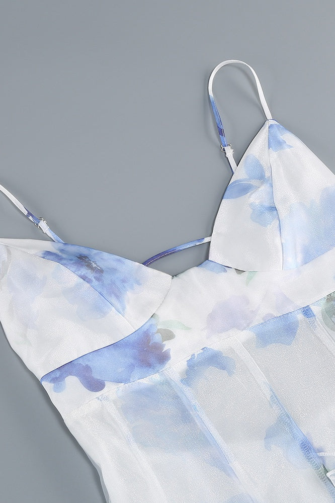 Crafted from delicate tulle, this dress features a vibrant floral print in an A-line silhouette. It presents a V-neckline with spaghetti straps, a zip closure at the back, and a high side slit. The design is completed with a flowing ruffle hem and an alluring open back.