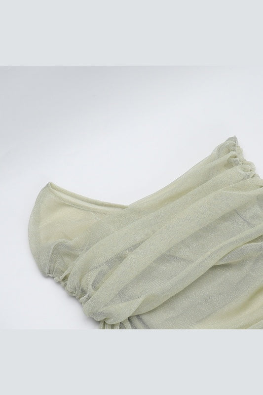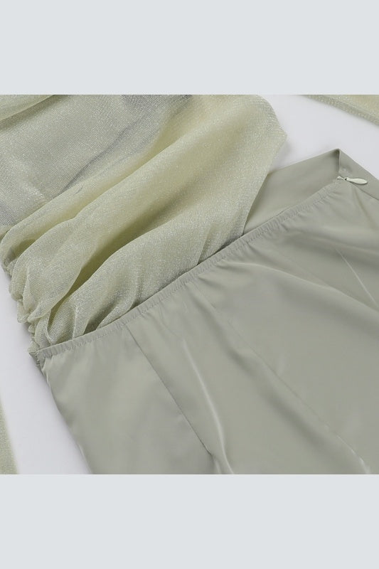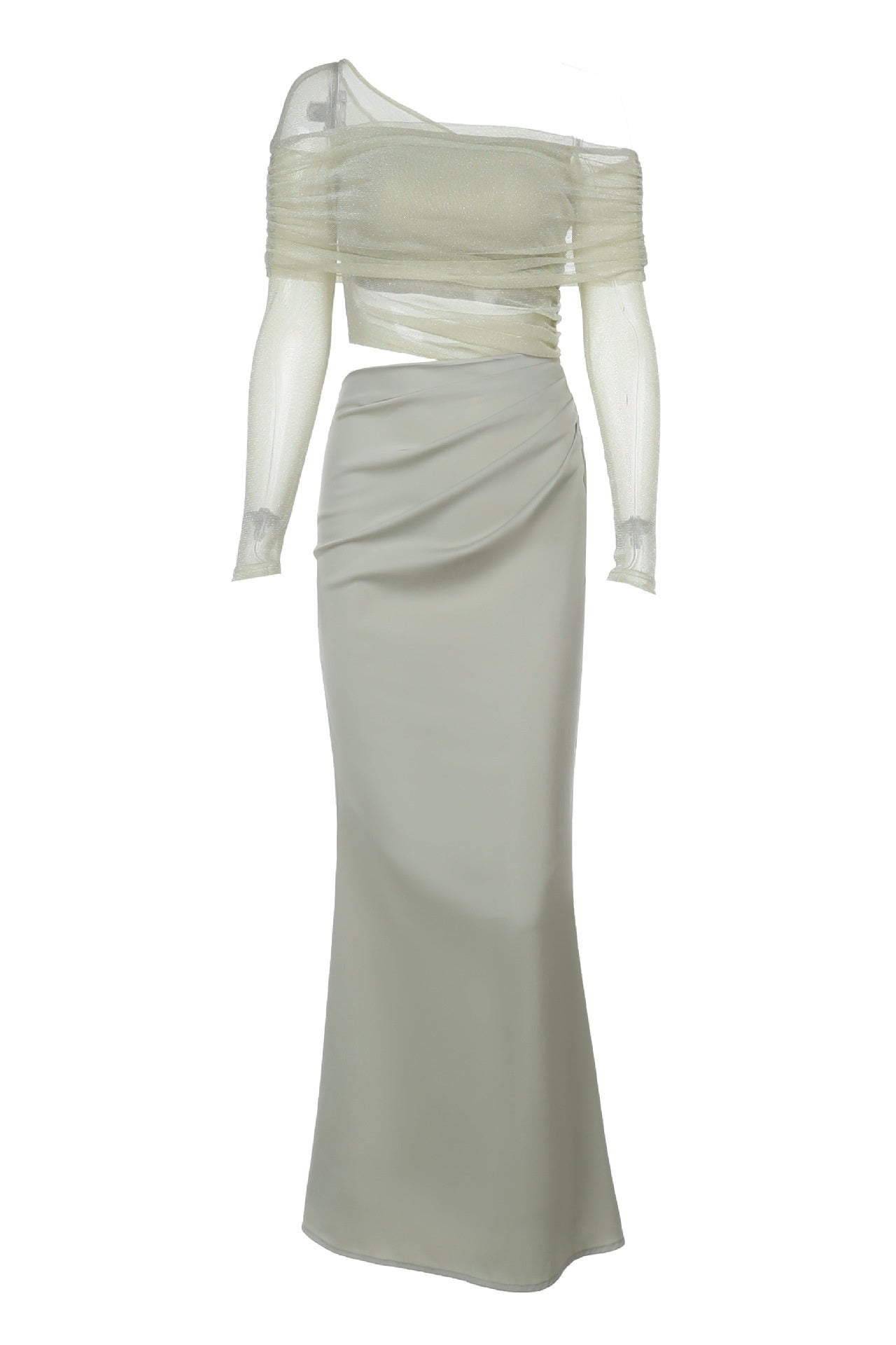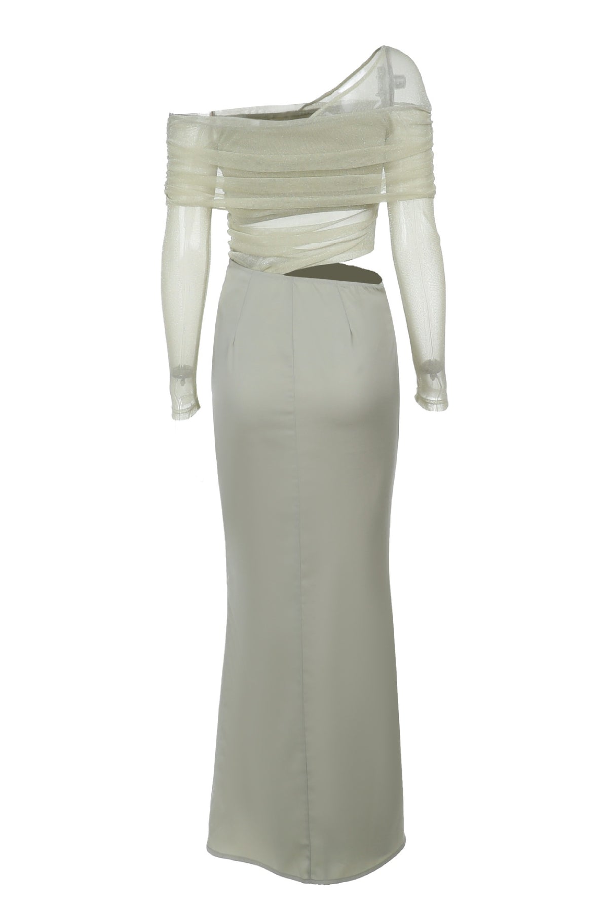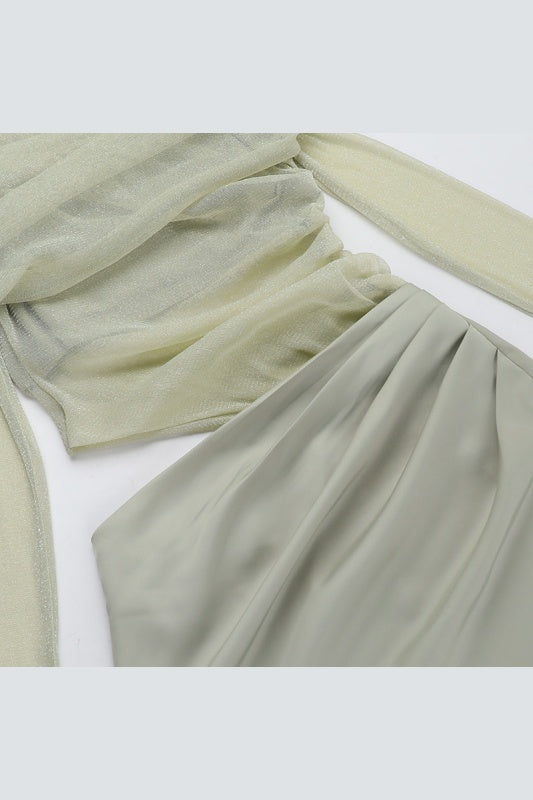 Crafted from a blend of spandex and tulle, this sage green bodycon dress features an asymmetrical neckline and long sleeves. It highlights a waist cut-out detail and offers a sleek, figure-hugging fit with its elegant long length.